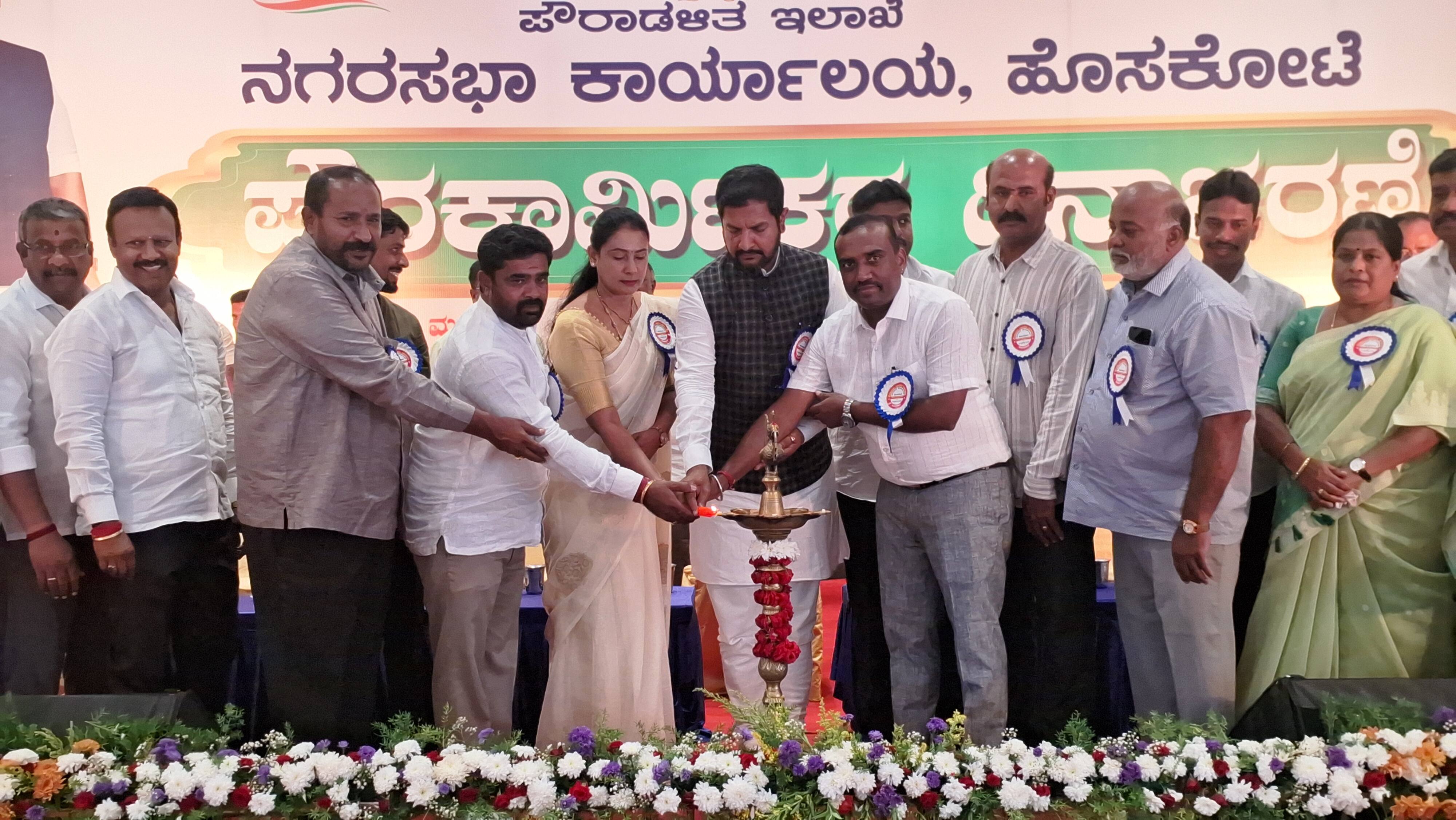 ನಗರದಲ್ಲಿ ನಗರಸಭೆಯ ಪೌರಕಾರ್ಮಿಕರ ದಿನಾಚರಣೆ ಕಾರ್ಯಕ್ರಮದಲ್ಲಿ ಮಾತನಾಡಿದ ಅವರು, ನಗರ ಸ್ವಚ್ಛತೆ ದೃಷ್ಟಿಯಿಂದ ನಾಗರಿಕರು ಕೇವಲ ಪೌರಕಾರ್ಮಿಕರನ್ನು ಅವಲಂಬಿಸದೆ ವಾರಕ್ಕೆ ಒಮ್ಮೆಯಾದರೂ ಪೌರಕಾರ್ಮಿಕರ ಜೊತೆಗೂಡಿ ನಗರದ ಸ್ವಚ್ಛತೆಗೆ ಸಹಕರಿಸಬೇಕು. ನಾನು ಕೂಡ ನಿಮ್ಮೊಂದಿಗೆ ಸ್ವಚ್ಛತಾ ಕಾರ್ಯದಲ್ಲಿ ಭಾಗಿಯಾಗುತ್ತೇನೆ. ನಗರದ ಅಭಿವೃದ್ಧಿ ದೃಷ್ಟಿಯಿಂದ ಎಲ್ಲಾ ರೀತಿಯಲ್ಲೂ ಶ್ರಮಿಸುತ್ತಿದ್ದು ಹೊಸಕೋಟೆ ನಗರವನ್ನು ಮಾದರಿಯಾಗಿ ನಿರ್ಮಾಣ ಮಾಡುವುದೇ ಗುರಿಯಾಗಿದೆ ಎಂದು ಹೇಳಿದರು.ನಗರಾಭಿವೃದ್ಧಿಗಾಗಿ ನಗರೋತ್ಥಾನ ಯೋಜನೆಯಡಿ 60 ಕೋಟಿ ಕಾಮಗಾರಿ, ಮುಖ್ಯಮಂತ್ರಿಗಳ ವಿಶೇಷ ಅನುದಾನದಲ್ಲಿ 15 ಕೋಟಿ, ಎತ್ತಿನಹೊಳೆ ಯೋಜನೆ ಅಡಿಯಲ್ಲಿ 8 ಕೋಟಿ, ಬಿಎಂಆರ್ಡಿಎ ಅನುದಾನದಲ್ಲಿ 19 ಕೋಟಿ ಕಾಮಗಾರಿಯನ್ನು ಕೈಗೆತ್ತಿಕೊಳ್ಳಲಾಗಿದೆ. ಹಂತ ಹಂತವಾಗಿ ನಗರಾಭಿವೃದ್ಧಿ ಕಾಣಲಿದೆ. ಅಲ್ಲದೆ ಹಲವಾರು ವರ್ಷಗಳಿಂದ ಬಾಕಿ ಉಳಿದಿದ್ದ ಒಳಚರಂಡಿ ಕಾಮಗಾರಿಗು ಸಹ 30 ಕೋಟಿ ಅನುದಾನ ತಂದಿದ್ದು ಕಾಮಗಾರಿಗೆ ವೇಗ ನೀಡಲಾಗುವುದು. ಶಾಶ್ವತ ನೀರಾವರಿ ಯೋಜನೆ ಕಲ್ಪಿಸುವ ದೃಷ್ಟಿಯಿಂದ ಎತ್ತಿನಹೊಳೆ ನೀರನ್ನು ಹೊಸಕೋಟೆ ದೊಡ್ಡ ಕೆರೆಗೆ ತಂದು ಸಮರ್ಪಕ ನೀರು ಸರಬರಾಜಿಗೆ ಆದ್ಯತೆ ನೀಡಲಾಗುವುದು. ಉಳಿದಂತೆ ಕಾವೇರಿ ನೀರನ್ನು ಹೊಸಕೋಟೆ ನಗರಕ್ಕೆ ಬಂದರೆ ಪ್ರತಿ ದಿನ ನೀರು ಸರಬರಾಜು ಮಾಡಲು ಅನುಕೂಲವಾಗುತ್ತದೆ ಎಂದು ಹೇಳಿದರು.