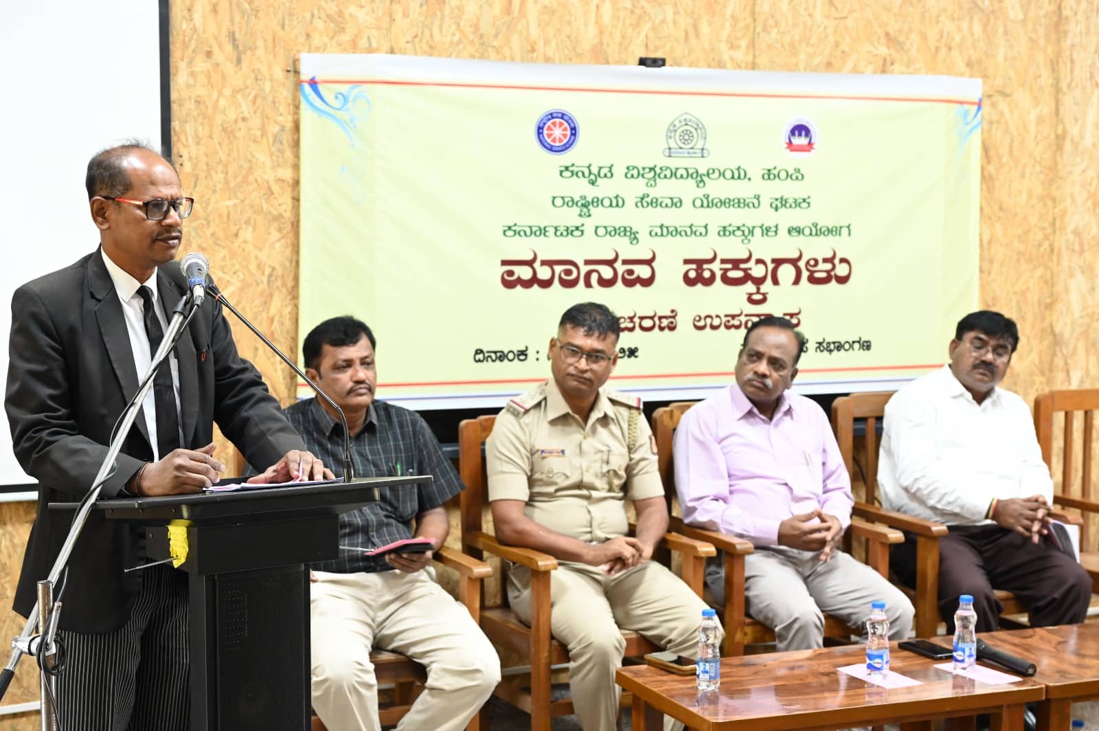 ಈ ವೇಳೆ ಉಪನ್ಯಾಸ ನೀಡಿದ ಅವರು, ಮಹಾಯುದ್ಧದ ಸಂದರ್ಭದಲ್ಲಿ ಜೀವಸಂಕುಲಕ್ಕೆ ಅಪಾರ ಸಾವು, ನೋವುಗಳು ಸಂಭವಿಸಿದವು. ಅಂತಹ ದೊಡ್ಡ ಸಮಸ್ಯೆಗಳಿಗೆ ಪರಿಹಾರವಾಗಿ ಹಾಗೂ ಮುಂದಿನ ಜೀವ ಸಂಕುಲಕ್ಕೆ ಸ್ವತಂತ್ರವನ್ನು ನೀಡುವ ಚಿಂತನೆಯಿಂದ 1948ರ ಡಿಸೆಂಬರ್ 10ರಂದು ವಿಶ್ವಸಂಸ್ಥೆಯು ಮಾನವ ಹಕ್ಕುಗಳ ಆಯೋಗವನ್ನು ಘೋಷಣೆ ಮಾಡಲಾಯಿತು ಎಂದರು.ಹಂಪಿ ಪೊಲೀಸ್ ವೃತ್ತ ನಿರೀಕ್ಷಕ ರಾಜೇಶ್ ಬಟಗುರ್ಕಿ ಮಾತನಾಡಿದರು. ಕನ್ನಡ ವಿಶ್ವವಿದ್ಯಾಲಯದ ಕುಲಪತಿ ಡಾ.ಡಿ.ವಿ. ಪರಮಶಿವಮೂರ್ತಿ ಅಧ್ಯಕ್ಷತೆ ವಹಿಸಿ ಮಾತನಾಡಿ, ಸಂವಿಧಾನವು ವಿವಿಧ ಹಕ್ಕುಗಳನ್ನು ನೀಡಿದ್ದು, ಈ ಹಕ್ಕುಗಳು ದುರುಪಯೋಗ ಆಗದೆ ಇರುವ ರೀತಿಯಲ್ಲಿ ಮಾನವ ಹಕ್ಕುಗಳ ಆಯೋಗ ನೋಡಿಕೊಳ್ಳುತ್ತದೆ. ಸಮಾಜವು ಎಷ್ಟೇ ಮುಂದುವರೆದರೂ ಹಿಂದಿನಂತೆ ಮಹಿಳೆಯರ ಮೇಲಿನ ತಿರಸ್ಕಾರ, ದಬ್ಬಾಳಿಕೆ, ಶೋಷಣೆ ನಡೆಯುತ್ತಿದ್ದು ಪ್ರಮುಖವಾಗಿ ಮಹಿಳೆಯರು ಮಾನವ ಹಕ್ಕುಗಳ ಬಗ್ಗೆ ಕಡ್ಡಾಯವಾಗಿ ಮಾಹಿತಿ ತಿಳಿದುಕೊಳ್ಳಬೇಕು ಎಂದರು.