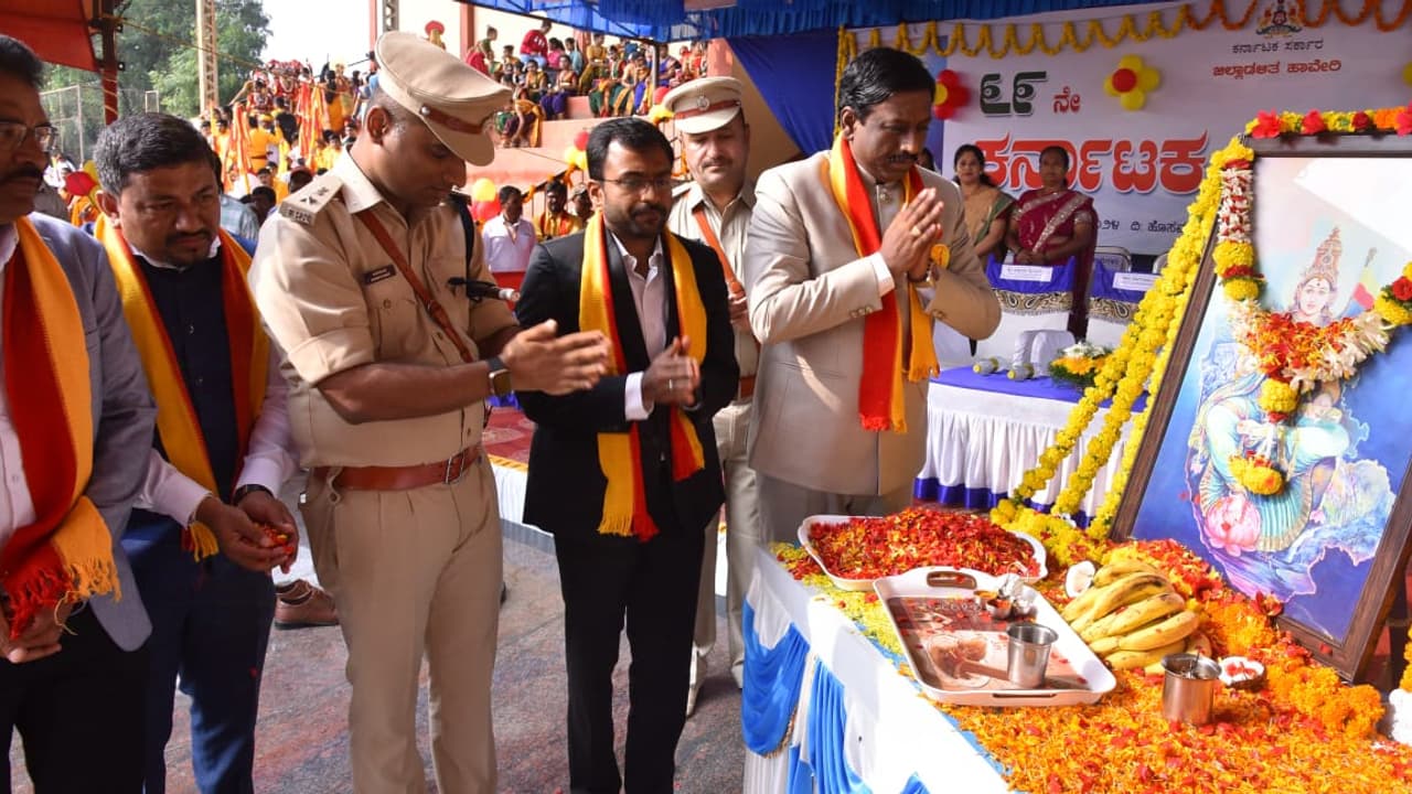 ಪಥಸಂಚಲನ ತಂಡಗಳಿಗೆ ಹಾಗೂ ನೃತ್ಯ ಪ್ರದರ್ಶನ ಮಾಡಿದ ಶಾಲಾ ಮಕ್ಕಳಿಗೆ ಪ್ರಶಂಸಾ ಪತ್ರ ಹಾಗೂ ನೆನಪಿನ ಕಾಣಿಕೆ ನೀಡಲಾಯಿತು. ಕಾರ್ಯಕ್ರಮದಲ್ಲಿ ಜಿಪಂ ಮುಖ್ಯ ಕಾರ್ಯನಿರ್ವಹಣಾಧಿಕಾರಿ ಅಕ್ಷಯ್ ಶ್ರೀಧರ್, ಜಿಲ್ಲಾ ಪೊಲೀಸ್ ವರಿಷ್ಠಾಧಿಕಾರಿ ಅಂಶುಕುಮಾರ, ಅಪರ ಜಿಲ್ಲಾಧಿಕಾರಿ ಡಾ. ನಾಗರಾಜ, ಹೆಚ್ಚುವರಿ ಜಿಲ್ಲಾ ಪೊಲೀಸ್ ವರಿಷ್ಠಾಧಿಕಾರಿ ಎಲ್.ಕೆ. ಶಿರಕೋಳ, ಉಪ ವಿಭಾಗಾಧಿಕಾರಿ ಚೆನ್ನಪ್ಪ, ತಹಸೀಲ್ದಾರ್ ಶರಣಮ್ಮ, ಜಿಲ್ಲಾ ಹಾಗೂ ತಾಲೂಕು ಮಟ್ಟದ ವಿವಿಧ ಇಲಾಖೆಗಳ ಅಧಿಕಾರಿಗಳು, ಇತರರು ಇದ್ದರು. ಶಿಸ್ತುಬದ್ಧ ಪಥಸಂಚಲನ: ಹಾವೇರಿ ಡಿ.ಆರ್.ನ ಶಂಕರಗೌಡ ಪಾಟೀಲ ಅವರ ನೇತೃತ್ವದಲ್ಲಿ ಸಶಸ್ತ್ರ ಮೀಸಲು ಪಡೆ, ನಾಗರೀಕರ ರಕ್ಷಣಾ ಪಡೆ, ಅಗ್ನಿ ಶಾಮಕ, ಅರಣ್ಯ ರಕ್ಷಕ ಪಡೆ, ಗೃಹ ರಕ್ಷಕದಳ, ಕೆಎಲ್ಇ ಪ್ರೌಢಶಾಲೆ, ಜೆಪಿ ರೋಟರಿ ಕನ್ನಡ ಮತ್ತು ಇಂಗ್ಲಿಷ ಮಾಧ್ಯಮ, ಹುಕ್ಕೇರಿಮಠ ಪ್ರೌಢಶಾಲೆ, ಗೆಳೆಯರ ಬಳಗ ಪ್ರೌಢಶಾಲೆ, ಸರ್ಕಾರಿ ಕನ್ನಡ ಪ್ರೌಢಶಾಲೆ, ಬಸವಭಾರತಿ ಪ್ರೌಢಶಾಲೆ, ಲಯನ್ಸ್ ಪ್ರೌಢಶಾಲೆ, ದಿವ್ಯ ಇಂಟನ್ಯಾಷನ್ ಸ್ಕೂಲ್ ಒಳಗೊಂಡಂತೆ 14 ತಂಡಗಳಿಂದ ಶಿಸ್ತುಬದ್ಧ ಪಥಸಂಚಲನ ಜರುಗಿತು.ಗಮನಸೆಳೆದ ಮಕ್ಕಳ ನೃತ್ಯ: ಸೇಂಟ್ ಆನ್ಸ್, ವಿದ್ಯಾದಾಯಿನಿ, ನವಚೇತನ ಹಾಗೂ ಸಾಯಿಚಂದ್ರ ಗುರುಕುಲ ಶಾಲೆ ಮಕ್ಕಳು, ಕನ್ನಡ ನಾಡು-ನುಡಿ, ನೆಲ-ಜಲ, ಸಂಸ್ಕೃತಿ-ಪರಂಪರೆ ಬಿಂಬಿಸುವ ಬಾರಿಸು ಕನ್ನಡ ಡಿಂಡಿಂವ ಓ ಕರ್ನಾಟಕ ಹೃದಯಶಿವ.., ಹಚ್ಚೆವು ಕನ್ನಡದ ದೀಪ..., ಒಂದೇ ಒಂದೇ ಕರ್ನಾಟಕ ಒಂದೇ..., ಹುಟ್ಟಿದರೇ ಕನ್ನಡನಾಡಲಿ ಹುಟ್ಟಬೇಕು..., ಕರುನಾಡೆ ಕೈಚಾಚಿದೇ ನೋಡೆ.. ಸೇರಿದಂತೆ ವಿವಿಧ ಹಾಡುಗಳಿಗೆ ಆಕರ್ಷಕ ನೃತ್ಯ ಪ್ರದರ್ಶನ ಮಾಡುವ ಮೂಲಕ ನೋಡುಗರ ಮೆಚ್ಚುಗೆಗೆ ಪಾತ್ರರಾದರು.ಶ್ರೀ ಭುವನೇಶ್ವರಿ ತಾಯಿ ಭಾವಚಿತ್ರ ಮೆರವಣಿಗೆ:ಕಾರ್ಯಕ್ರಮಕ್ಕೂ ಮೊದಲು ನಗರದ ಮೈಲಾರ ಮಹದೇವ ವೃತ್ತದಿಂದ ಆರಂಭಗೊಂಡ ಶ್ರೀ ಭುವನೇಶ್ವರಿ ತಾಯಿ ಭಾವಚಿತ್ರ ಹಾಗೂ ವಿವಿಧ ಇಲಾಖೆಗಳ ಸ್ತಬ್ಧಚಿತ್ರಗಳ ಮೆರವಣಿಗೆ ನಗರದ ಪ್ರಮುಖ ಬೀದಿಗಳಲ್ಲಿ ಸಂಚರಿಸಿ ಜಿಲ್ಲಾ ಕ್ರೀಡಾಂಗಣ ತಲುಪಿತು. ಮೆರವಣಿಗೆಯಲ್ಲಿ ಜಿಲ್ಲಾ ಹಾಗೂ ತಾಲೂಕು ಮಟ್ಟದ ಅಧಿಕಾರಿಗಳು, ವಿವಿಧ ಕಲಾತಂಡಗಳು, ಶಾಲಾ ವಿದ್ಯಾರ್ಥಿಗಳು ಭಾಗವಹಿಸಿದ್ದರು.