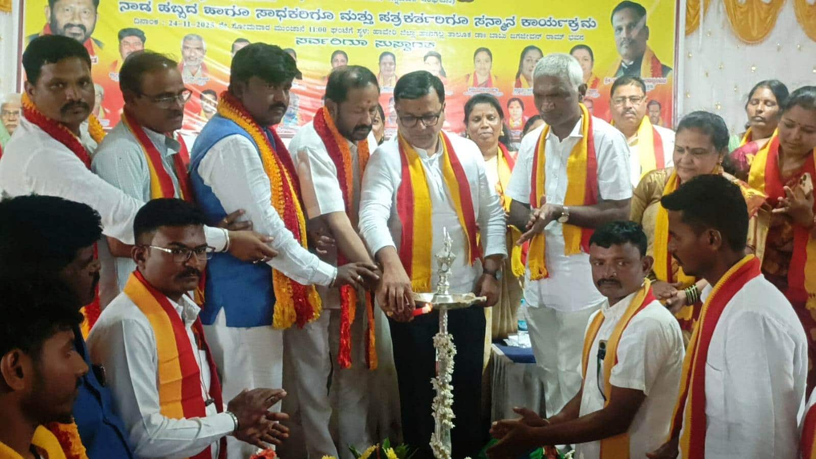 ಹಾನಗಲ್ಲ: ಕರ್ನಾಟಕವನ್ನು ವಿಭಜಿಸುವ ಮನಸ್ಸಿನವರಿಗೆ ಧಿಕ್ಕಾರ ಹೇಳೋಣ, ನವೆಂಬರ್ ಕನ್ನಡಿಗರಿಗೆ ಎಚ್ಚರಿಕೆ ಹೇಳೋಣ, ಸರ್ಕಾರ ಖಾಸಗಿ ಶಾಲೆಗಳಿಗೆ ಅನುಮತಿ ನೀಡುವುದನ್ನು ನಿಲ್ಲಿಸಲು ಒತ್ತಾಯಿಸೋಣ, ಕನ್ನಡದ ಉಳಿವಿಗೆ ಶಕ್ತಿಯಾಗೋಣ ಎಂದು ಕರ್ನಾಟಕ ರಕ್ಷಣಾ ವೇದಿಕೆ ಸ್ವಾಭಿಮಾನಿ ಬಣದ ರಾಜ್ಯಾಧ್ಯಕ್ಷ ಪಿ. ಕೃಷ್ಣೆಗೌಡ ಕರೆ ನೀಡಿದರು. ಸೋಮವಾರ ಇಲ್ಲಿನ ಬಾಬು ಜಗಜೀವನರಾಮ ಭವನದಲ್ಲಿ ಕರ್ನಾಟಕ ರಕ್ಷಣಾ ವೇದಿಕೆ ಸ್ವಾಭಿಮಾನಿ ಬಣ ಕನ್ನಡ ರಾಜ್ಯೋತ್ಸವದ ಅಂಗವಾಗಿ ಆಯೋಜಿಸಿದ ಹಾವೇರಿ ಜಿಲ್ಲಾ ಮಟ್ಟದ ನಾಡ ಹಬ್ಬ ಕಾರ್ಯಕ್ರಮವನ್ನು ಉದ್ಘಾಟಿಸಿ ಮಾತನಾಡಿದ ಅವರು, ನಮ್ಮ ಸಂಘಟನೆ 30 ಕನ್ನಡ ಶಾಲೆಗಳನ್ನು ದತ್ತು ಪಡೆದು ಅಭಿವೃದ್ಧಿಪಡಿಸುತ್ತಿದೆ. ಈಗ ಯುವ ಪೀಳಿಗೆ ಕನ್ನಡದ ಅಭಿಮಾನ ಬೆಳೆಸಿಕೊಳ್ಳಲು ನಾವೆಲ್ಲ ಪ್ರೇರಣೆಯಾಗಬೇಕಾಗಿದೆ. ಅಂಗನವಾಡಿಗಳಿಗೆ ಕಳಪೆ ಆಹಾರ ಪೂರೈಕೆಯಾಗುತ್ತಿದೆ. ಮೊರಾರ್ಜಿ ವಸತಿ ಶಾಲೆಗಳ ವ್ಯವಸ್ಥೆ ಹದಗೆಟ್ಟಿದೆ. ಕನ್ನಡ ನೆಲದಲ್ಲಿ ಕನ್ನಡಿಗರಿಗೇ ನ್ಯಾಯ ಕೊಡಿಸಲು ಹೋರಾಡುವ ಸ್ಥಿತಿ ಇದೆ. ಕೊಡಗಿನ ಕನ್ನಡ ಮಠವನ್ನು ಉಳಿಸಲು 15 ವರ್ಷ ನ್ಯಾಯಾಲಯದ ಹೋರಾಟವೂ ಸೇರಿ ಕಷ್ಟಪಡಬೇಕಾಯಿತು. ನಮ್ಮ ನಾಡು ನುಡಿ ಜಲ ಸಂಸ್ಕೃತಿಯ ಉಳಿವಿಗಾಗಿ ನಾವು ಬದ್ಧರಾಗೋಣ. ಕನ್ನಡವೇ ನಮ್ಮ ಶಕ್ತಿ ಎಂದರು.ಶಾಸಕ ಶ್ರೀನಿವಾಸ ಮಾನೆ ಮುಖ್ಯ ಅತಿಥಿಯಾಗಿ ಮಾತನಾಡಿ, ಕನ್ನಡ ನ್ಯಾಯಕ್ಕಾಗಿ ಹೋರಾಡುವ ಗಟ್ಟಿ ನೆಲ. ಕನ್ನಡಕ್ಕೆ ಅಂತರಾಷ್ಟ್ರೀಯ ಗೌರವವಿದೆ. ಇಂಗ್ಲಿಷ್ ಬಳಕೆ ನಿಲ್ಲಿಸಿದರೆ ಕನ್ನಡ ತಾನಾಗಿಯೇ ಉಳಿಯುತ್ತದೆ. ಕನ್ನಡತ್ವದ ಸಂಕಲ್ಪ ನಮ್ಮದಾಗಲಿ. ಬಸವಣ್ಣನವರ ಸಮಾನತೆ ಮಾನವೀಯತೆ ಪ್ರಭುದ್ಧ ಸಂದೇಶಗಳು ಕನ್ನಡದ ಶಕ್ತಿ. ಅವರ ಮೂಲ ಆಶಯವನ್ನು ಉಳಿಸಿಕೊಳ್ಳಲು ಮುಂದಾಗೋಣ. ನಮ್ಮ ಕರ್ನಾಟರ ರಾಜ್ಯ ಸರ್ಕಾರ ಜ್ಞಾನಪೀಠ ಪ್ರಶಸ್ತಿ ಪುರಸ್ಕೃತ ಸಾಹಿತಿಗಳ ಊರಿನ ಅಭಿವೃದ್ಧಿಗೆ ತಲಾ ಕೋಟಿ ರೂ ಅನುದಾನ ನೀಡಿದೆ. ಕನ್ನಡಕ್ಕಾಗಿ ದುಡಿದವರನ್ನು ನೆನೆಯೋಣ. ಕನ್ನಡದ ಶಕ್ತಿಯನ್ನು ಹೆಚ್ಚಿಸೋಣ ಎಂದರು. ಹುಬ್ಬಳ್ಳಿ ಮೂರುಸಾವಿರಮಠದ ಜಗದ್ಗುರು ಡಾ. ಗುರುಸಿದ್ಧರಾಜಯೋಗೀಂದ್ರ ಮಹಾಸ್ವಾಮಿಗಳು ಮಾತನಾಡಿ, ಸತ್ಯ ನ್ಯಾಯ ಧರ್ಮದ ಆಸಕ್ತಿ ಮೂಡಿಸುವಲ್ಲಿ ಕನ್ನಡ ಸಂಘಟನೆಗಳು ಮುಂದಾಗಲಿ. ಸತ್ಯ ನ್ಯಾಯ ಹೇಳುವವರನ್ನು ಹತ್ತಿಕ್ಕುವುದನ್ನೇ ನೋಡುತ್ತಿದ್ದೇವೆ. ಟೀಕಾಕಾರರೇ ಈಗ ವಿಜೃಂಭಿಸುತ್ತಿದ್ದಾರೆ. ನಮ್ಮ ಸಂವಿಧಾನದ ಆಶಯವೇ ನಮ್ಮೆಲ್ಲರ ನಡುವಳಿಕೆಯಾಗಬೇಕು. ಅಪರಾಧಗಳು ಇಳಿದು, ಉಪಕಾರಗಳು ಬೆಳಗಲಿ. ನಮ್ಮ ಮನೆಗಳು ಸಂತಸದ ಮನೆಗಳಾಗಿಲಿ. ಕರ್ನಾಟಕದ ಪ್ರಾಕೃತಿಕ ಐಸಿರಿಯನ್ನು ಗಣಿಗಾರಿಕೆ ಮೂಲಕ ಹಾಳು ಮಾಡುವ, ನಮ್ಮ ಸಂಪತ್ತನ್ನು ಲೂಟಿ ಮಾಡುವವರ ಬಗ್ಗೆ ಈಗಲಾದರೂ ಎಚ್ಚರಿಕೆ ವಹಿಸೋಣ ಎಂದರು. ಕನ್ನಡ ಸಾಹಿತ್ಯ ಪರಿಷತ್ ಜಿಲ್ಲಾ ಮಾಜಿ ಅಧ್ಯಕ್ಷ ಪ್ರೊ.ಮಾರುತಿ ಶಿಡ್ಲಾಪುರ, ಡಾ.ಎಚ್.ಎಚ್. ಹೆಬ್ಬಾಳ, ಜಿಲ್ಲಾ ಸರ್ಕಾರಿ ನೌಕರರ ಸಂಘದ ಅಧ್ಯಕ್ಷ ಮಲ್ಲೇಶ ಕರಿಗಾರ, ಡಾ.ವೀರೇಶ ಹಿತ್ತಲಮನಿ ಮಾತನಾಡಿದರು. ಮಾರುತಿ ಪೇಟಕರ, ಹೊನ್ನಪ್ಪ ಬಾರ್ಕಿ, ರಾಜೇಶ ಪಾಟೀಲ, ಗುರುನಾಥ ಗವಾಣಿಕರ, ಇರ್ಫಾನ್ ನಾಗರವಳ್ಳಿ, ಮಲ್ಲಿಕಾರ್ಜುನ ಸುಣಗಾರ, ಮಾರುತಿ ಶಿಡ್ಲಾಪುರ, ಗೀತಾ ಶಿಡ್ಲಣ್ಣನವರ ಅವರಿಗೆ ಕದಂಬ ಪ್ರಶಸ್ತಿ ನೀಡಿ ಗೌರವಿಸಲಾಯಿತು. ಕರ್ನಾಟಕ ರಕ್ಷಣಾ ವೇದಿಕೆ ಸ್ವಾಭಿಮಾನಿ ಬಣದ ತಾಲೂಕು ಅಧ್ಯಕ್ಷ ಮಾರುತಿ ತಾಂ