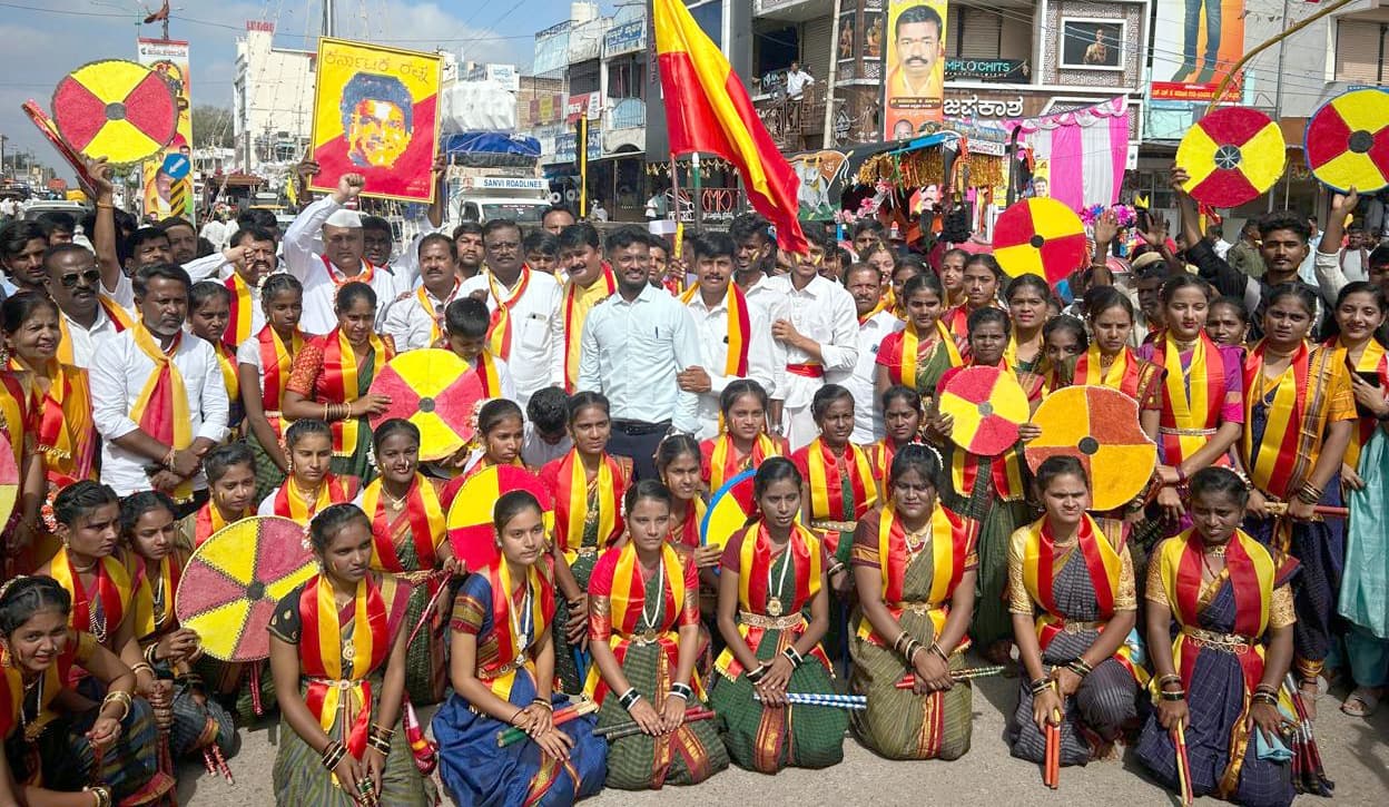 ಕರವೇಯಿಂದ ರಾಜ್ಯೋತ್ಸವ: ಪಟ್ಟಣದ ಕಾಲಕಾಲೇಶ್ವರ ವೃತ್ತದಲ್ಲಿ ಶನಿವಾರ ಕರ್ನಾಟಕ ರಕ್ಷಣಾ ವೇದಿಕೆ (ನಾರಾಯಣಗೌಡ ಬಣದಿಂದ) ೭೦ನೇ ಕನ್ನಡ ರಾಜ್ಯೋತ್ಸವ ಅದ್ಧೂರಿಯಾಗಿ ನಡೆಯಿತು. ಈ ವೇಳೆ ಕರವೇ ಮುಖಂಡ ಎಚ್.ಎಸ್. ಸೋಂಪೂರ ಮಾತನಾಡಿ, ನಾಡು, ನುಡಿ ಹಾಗೂ ಗಡಿ ವಿಷಯದಲ್ಲಿ ರಾಜಿ ಇಲ್ಲದ ಹೋರಾಟವನ್ನು ನಡೆಸುತ್ತಾ ಕರವೇ ಬಂದಿದೆ. ಅಂದಾನಪ್ಪ ದೊಡ್ಡಮೇಟಿ ಸೇರಿ ಅನೇಕರು ಕನ್ನಡದ ಧ್ವನಿಯನ್ನು ದಿಲ್ಲಿವರೆಗೆ ಮುಟ್ಟಿಸಿದ್ದಾರೆ. ಹೀಗಾಗಿ ಭಾಷೆಯ ಹಿರಿಮೆ ಜತೆಗೆ ಸರ್ವ ಜನಾಂಗದ ತೋಟವಾಗಿರುವ ಕರ್ನಾಟಕವು ದೇಶದಲ್ಲಿ ವಿಭಿನ್ನ. ಕನ್ನಡಿಗರ ಶಕ್ತಿ, ಶೌರ್ಯ ಹಾಗೂ ತಾಳ್ಮೆ ದೇಶದ ಇತಿಹಾಸದ ಪುಟದಲ್ಲಿ ರಾರಾಜಿಸುತ್ತಿದೆ ಎಂದರು.ಈ ವೇಳೆ ಕನ್ನಡ ಬಾವುಟ ಹಿಡಿದು ತಾಯಿ ಭುವನೇಶ್ವರಿಗೆ ಜೈಕಾರ ಘೋಷಣೆ ಕೂಗಿದರು. ಎಸ್ಎಂ ಭೂಮರಡ್ಡಿ ಕಾಲೇಜು ವಿದ್ಯಾರ್ಥಿನಿಯರ ವೇಷಭೂಷಣ ಹಾಗೂ ನೃತ್ಯ ಜನಮನ ಸೆಳೆಯಿತು.