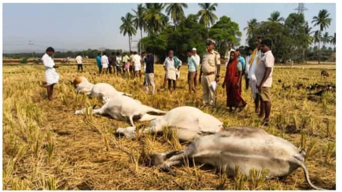 ಕನಕಗಿರಿ ತಾಲೂಕಿನ ಬಂಕಾಪುರ ಗ್ರಾಮದ ಪಾರ್ವತಮ್ಮ ಅವರಿಗೆ ಸೇರಿ ಮೂರು ಆಕಳು ಮತ್ತು ನಾಗೇಶಪ್ಪನಿಗೆ ಸೇರಿ ಮೂರು ಆಕಳು ಸಾವಿಗೀಡಾಗಿವೆ. ಇದರಿಂದ ಸುಮಾರು ನಾಲ್ಕು ಲಕ್ಷ ಹಾನಿಯಾಗಿದ್ದು, ಪರಿಹಾರ ನೀಡುವಂತೆ ಆಗ್ರಹಿಸಿದ್ದಾರೆ.ಭತ್ತ ಕಟಾವು ಆದ ಮೇಲೆ ಕುರಿ ಮತ್ತು ಆಕಳನ್ನು ಹೊಲದಲ್ಲಿಯೇ ಬಿಡಲಾಗಿತ್ತು. ತಡರಾತ್ರಿಯಲ್ಲಿ ಘಟನೆ ನಡೆದಿದೆ. ಗಂಗಾವತಿ ಗ್ರಾಮೀಣ ಠಾಣೆಯಲ್ಲಿ ಪ್ರಕರಣ ದಾಖಲಾಗಿದೆ.