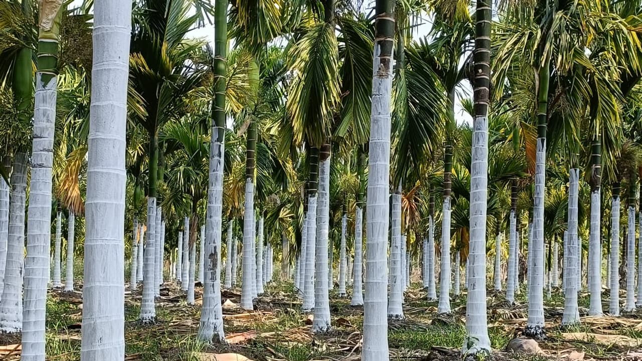 ಹೊಳೆಹೊನ್ನೂರು ಸಮೀಪದ ಸೈದರ ಕಲ್ಲಹಳ್ಳಿಯ ಮಲ್ಲೇಶ್ ಅವರ ತೋಟದಲ್ಲಿ ಅಡಕೆ ಮರಗಳಿಗೆ ಸುಣ್ಣ ಬಳಿದಿರುವುದು.