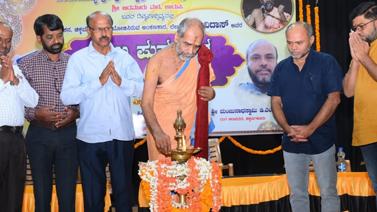 26 ಕೆಸಿಕೆಎಂ 2ಉದ್ಭವ ಪ್ರಕಾಶನ ಚಿಕ್ಕಮಗಳೂರಿನ ಕುವೆಂಪು ಕಲಾ ಮಂದಿರದಲ್ಲಿ ಆಯೋಜಿಸಿದ್ದ ಅಂಕಣಕಾರ ಟಿ.ದೇವಿದಾಸ್ ವಿರಚಿತ ನಾಲ್ಕು ಪುಸ್ತಕಗಳ ಲೋಕಾರ್ಪಣೆ ಕಾರ್ಯಕ್ರಮವನ್ನು ಉಡುಪಿ ಅದಮಾರು ಮಠದ ವಿಶ್ವಪ್ರಿಯ ತೀರ್ಥ ಸ್ವಾಮೀಜಿ ಉದ್ಘಾಟಿಸಿದರು.