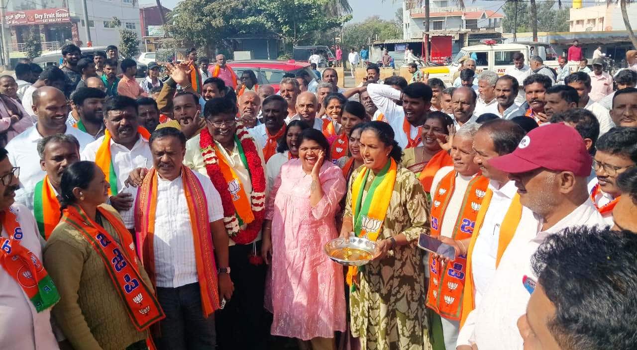 ಬಾಶೆಟ್ಟಿಹಳ್ಳಿ ಪಟ್ಟಣ ಪಂಚಾಯಿತಿ ಚುನಾವಣೆಯಲ್ಲಿ ಅಮೋಘ ಗೆಲುವು ದಾಖಲಿಸಿದ ಬಳಿಕ ಬಿಜೆಪಿ ಅಭ್ಯರ್ಥಿಗಳು, ಕಾರ್ಯಕರ್ತರ ವಿಜಯೋತ್ಸವ.