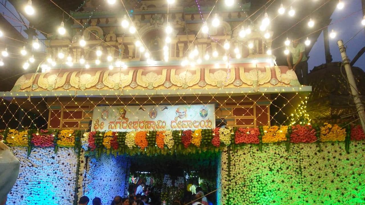 ಸಹಸ್ರಾರು ದ್ರಾಕ್ಷಿಗೊಂಚಲು:ದೇಗುಲದ ಮುಂಭಾಗವನ್ನು ಗುಲಾಬಿ ಹೂಗಳಿಂದ ಅಲಂಕರಿಸಲಾಗಿತ್ತು. ಮುಂಭಾಗದಲ್ಲಿ 25 ಅಡಿ ಎತ್ತರದ ಶಿವನ ಮೂರ್ತಿಯನ್ನು ಪ್ರತಿಷ್ಠಾಪಿಸಲಾಗಿತ್ತು. ದೇವಾಲಯದ ಮೂಲ ವಿಗ್ರಹವಾದ ನಗರೇಶ್ವರ ಸ್ವಾಮಿ, ಪಾರ್ವತಾ ದೇವಿಗೆ, ಮಹಾಗಣಪತಿ ವಿಗ್ರಹಗಳಿಗೂ ವಿಶೇಷ ಅಲಂಕಾರಗಳನ್ನು ಮಾಡಲಾಗಿತ್ತು. ದೇಗುಲ ಆವರಣದಲ್ಲಿ ಭಕ್ತಾದಿಗಳು ಅಕ್ಕಿ ಆರತಿಗಳನ್ನು ಬೆಳಗಿ ಸಂಭ್ರಮಿಸಿದರು.