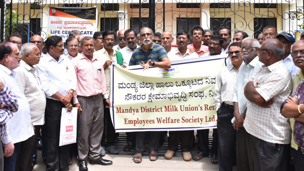 ನಿವೃತ್ತರಿಗೆ ಇಪಿಎಫ್ ಪಿಂಚಣಿ ನೀಡಲು ವಿಳಂಬ ಮಾಡುತ್ತಿರುವುದರಿಂದ ಖಂಡಿಸಿ ಮಂಡ್ಯ ಜಿಲ್ಲಾ ಹಾಲು ಒಕ್ಕೂಟದ ನಿವೃತ್ತ ನೌಕರರ ಕ್ಷೇಮಾಭಿವೃದ್ಧಿ ಸಂಘದವರು ಮೈ,ಸೂರಿನ ಗಾಯತ್ರಿಪುರಂನಲ್ಲಿರುವ ಇಪಿಎಫ್ ಕಚೇರಿ ಮುಂಭಾಗದಲ್ಲಿ ಮಂಗಳವಾರ ಪ್ರತಿಭಟಿಸಿದರು.1995 ರಲ್ಲಿ ಕೇಂದ್ರ ಸರ್ಕಾರ ಇಪಿಎಫ್ ಕಾಯ್ದೆಗೆ ತಿದ್ದುಪಡಿ ತಂದು ಕುಟುಂಬ ಪಿಂಚಣಿ ಯೋಜನೆ ಬದಲಿಗೆ ಇಪಿಎಫ್ ಕಾಯ್ದೆ ಜಾರಿಗೆ ತಂದಿದೆ. ಆರಂಭದಲ್ಲಿ ದೇಶಾದ್ಯಂತ ಸುಮಾರು 24 ಸಾವಿರಕ್ಕೂ ಹೆಚ್ಚು ಮಂದಿಗೆ ನಿವೃತ್ತರಿಗೆ ವಾಸ್ತವ ವೇತನದ ಮೇಲೆ ಇಪಿಎಫ್ ಪಿಂಚಣಿ ಮಂಜೂರು ಮಾಡಿ ಕೆಲ ವರ್ಷ ಪಾವತಿಸಿ, ಕೆಲವರಿಗೆ ನಿಲ್ಲಿಸಿ ಪಕ್ಷಪಾತ ಮಾಡಲಾಗುತ್ತಿದೆ ಎಂದು ಅವರು ಆಗ್ರಹಿಸಿದರು.