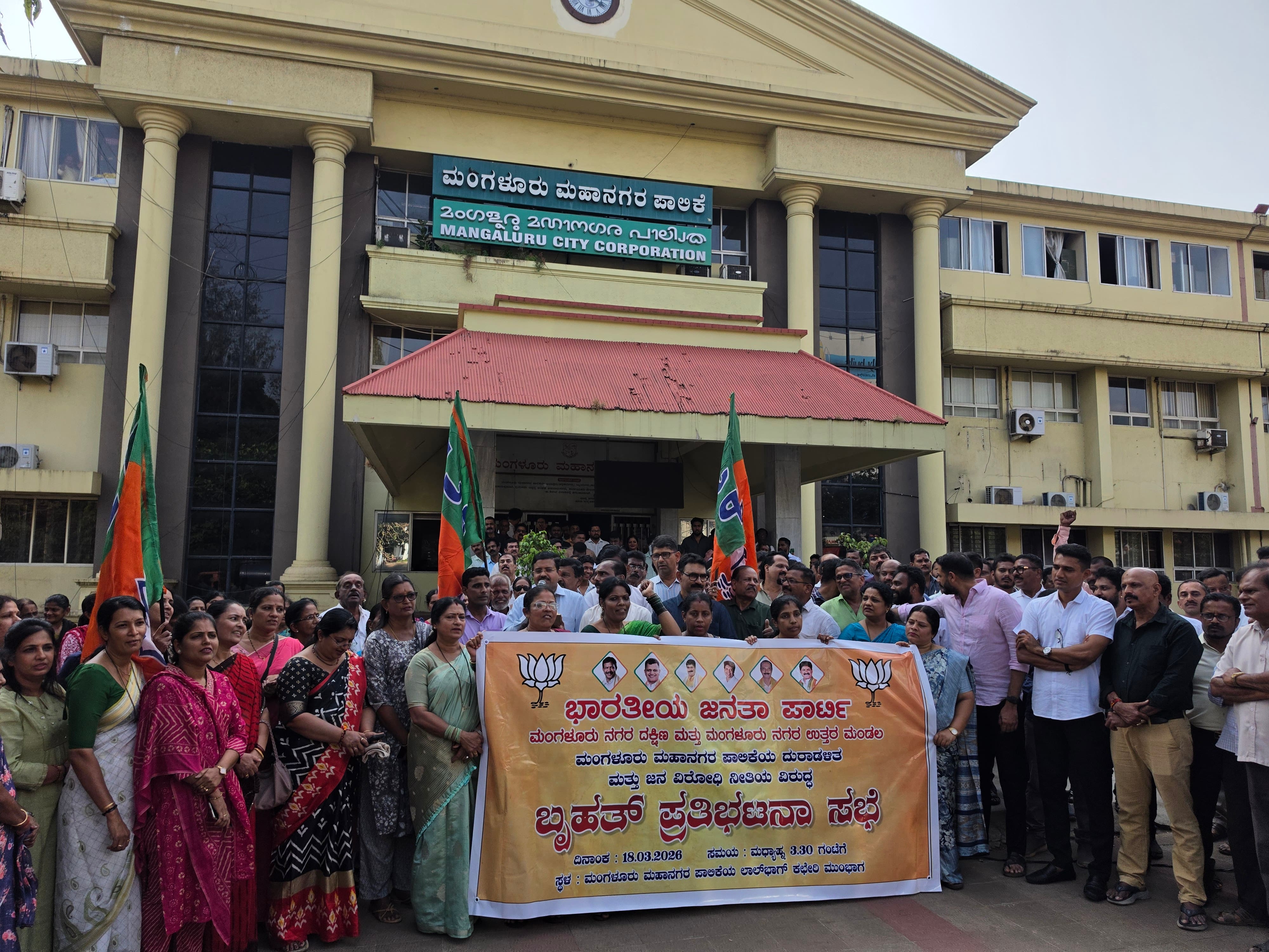 ಮಂಗಳೂರು ಮಹಾನಗರ ಪಾಲಿಕೆ ಆಡಳಿತವನ್ನು ಅಧಿಕಾರಶಾಹಿ ಮತ್ತು ಭ್ರಷ್ಟಾಚಾರದಿಂದ ಮುಕ್ತಗೊಳಿಸಿ, ಜನಸ್ನೇಹಿ ಮಾಡುವಂತೆ ಆಗ್ರಹಿಸಿ ಬಿಜೆಪಿ ಮಂಗಳೂರು ನಗರ ದಕ್ಷಿಣ ಮತ್ತು ಉತ್ತರ ಮಂಡಲದ ನೇತೃತ್ವದಲ್ಲಿ ಬುಧವಾರ ಮಂಗಳೂರು ಮಹಾನಗರ ಪಾಲಿಕೆ ಮುಂಭಾಗ ಪ್ರತಿಭಟನೆ ನಡೆಯಿತು.