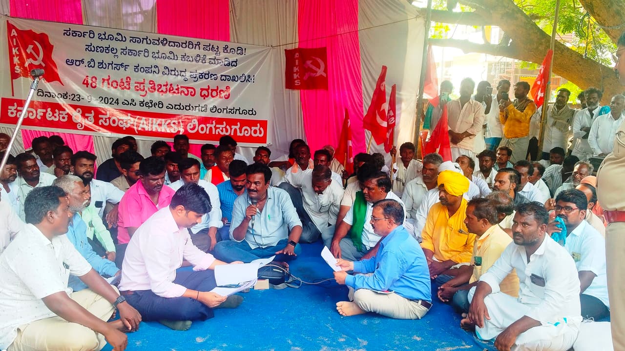 ಲಿಂಗಸುಗೂರು ಪಟ್ಟಣದ ಸಹಾಯಕ ಆಯುಕ್ತರ ಕಚೇರಿ ಮುಂದೆ ಕರ್ನಾಟಕ ರೈತ ಸಂಘ(ಎಐಕೆಕೆಎಸ್)ದಿಂದ ಧರಣಿ ನಡೆಸಿದರು.
