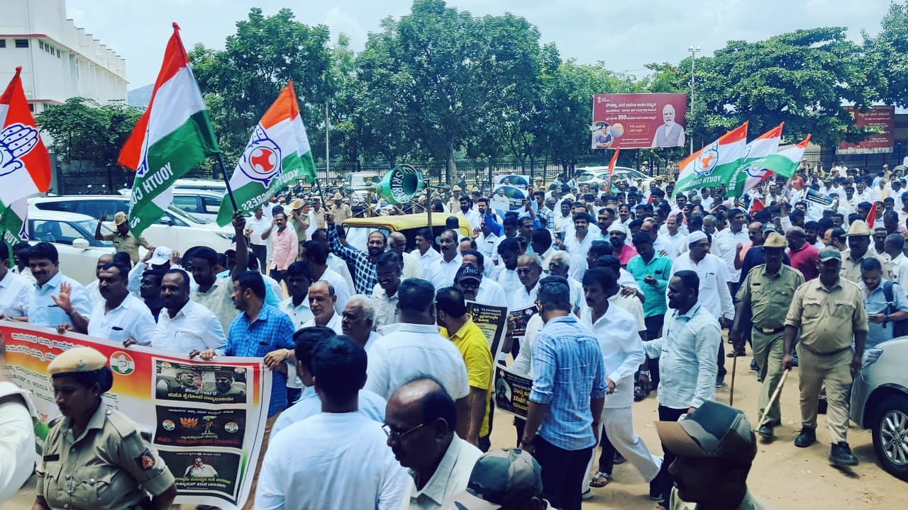 ಮುಖ್ಯಮಂತ್ರಿ ಸಿದ್ದರಾಮಯ್ಯ ಅವರ ವಿರುದ್ಧ ಪ್ರಾಸಿಕ್ಯೂಷನ್ಗೆ ಅನುಮತಿ ನೀಡಿರುವ ರಾಜ್ಯಪಾಲರ ಕ್ರಮ ಖಂಡಿಸಿ ನಗರದಲ್ಲಿ ಶಾಸಕ ಇಕ್ಬಾಲ್ ಹುಸೇನ್ ನೇತೃತ್ವದಲ್ಲಿ ಜಿಲ್ಲೆಯ ಎಲ್ಲಾ ಕಾಂಗ್ರೆಸ್ ಮುಖಂಡರು ಹಾಗೂ ಕಾರ್ಯಕರ್ತರು ಸೋಮವಾರ ಬೃಹತ್ ಪ್ರತಿಭಟನಾ ಮೆರವಣಿಗೆ ನಡೆಸಿದರು.