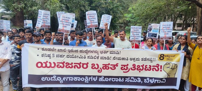 ಕೇಂದ್ರ ಮತ್ತು ರಾಜ್ಯ ಸರ್ಕಾರದ ವಿವಿಧ ಇಲಾಖೆಗಳಲ್ಲಿ ಖಾಲಿ ಇರುವ ಹುದ್ದೆಗಳನ್ನು ಭರ್ತಿ ಮಾಡುವುದು ಸೇರಿದಂತೆ ವಿವಿಧ ಬೇಡಿಕೆ ಈಡೇರಿಸುವಂತೆ ಒತ್ತಾಯಿಸಿ ಉದ್ಯೋಗ ಆಕಾಂಕ್ಷಿಗಳ ಹೋರಾಟ ಸಮಿತಿ ನೇತೃತ್ವದಲ್ಲಿ ಯುವಕರು, ವಿದ್ಯಾರ್ಥಿಗಳು ಬೃಹತ್ ಪ್ರತಿಭಟನೆ ನಡೆಸಿದರು. ನಗರದ ಚನ್ನಮ್ಮ ವೃತ್ತದಲ್ಲಿ ಬುಧವಾರ ಸೇರಿದ ಪ್ರತಿಭಟನಾಕಾರರು ಜಿಲ್ಲಾಧಿಕಾರಿ ಕಚೇರಿ ವರೆಗೆ ಮೆರವಣಿಗೆ ಸಾಗಿ ರಾಜ್ಯ ಸರ್ಕಾರದ ವಿರುದ್ಧ ಘೋಷಣೆ ಕೂಗಿ ಆಕ್ರೋಶ ವ್ಯಕ್ತಪಡಿಸಿದರು. ಬಳಿಕ ಜಿಲ್ಲಾಡಳಿತ ಮುಖಾಂತರ ರಾಜ್ಯ ಸರ್ಕಾರಕ್ಕೆ ಮನವಿ ಸಲ್ಲಿಸಿದರು.ಸರ್ಕಾರ ನೇಮಕಾತಿ ಪ್ರಕ್ರಿಯೆ ಚುರುಕುಗೊಳಿಸುವ ಮೂಲಕ 2025 ರೊಳಗಾಗಿ ವಿವಿಧ ಇಲಾಖೆಗಳಲ್ಲಿ ಖಾಲಿ ಇರುವ ಎಲ್ಲಾ ಹುದ್ದೆಗಳನ್ನು ಭರ್ತಿ ಮಾಡಿಕೊಳ್ಳಲು ಅಧಿಸೂಚನೆ ಹೊರಡಿಸಬೇಕು. ಎಲ್ಲ ಹಂತದ ಹುದ್ದೆಗಳಿಗೆ ಕನಿಷ್ಠ ವಯೋಮಿತಿ 5 ವರ್ಷದವರೆಗೆ ಸಡಲಿಕೆ ಮಾಡಬೇಕು. ಶಾಲೆಗಳಲ್ಲಿ ಸಂಗೀತ, ಚಿತ್ರಕಲೆ ಮತ್ತು ದೈಹಿಕ ಶಿಕ್ಷಕರನ್ನು ನೇಮಕಾತಿ ಮಾಡಿಕೊಳ್ಳಬೇಕು. ಗುತ್ತಿಗೆ ಆಧಾರಿತ ಹುದ್ದೆಗಳನ್ನು ರದ್ದುಪಡಿಸಿ ಉದ್ಯೋಗ ಭದ್ರತೆ ಖಾತ್ರಿಪಡಿಸಬೇಕು. ಕೆಪಿಎಸ್ಸಿ ಯಲ್ಲಿ ನಡೆಯುತ್ತಿರುವ ಭ್ರಷ್ಟಾಚಾರ ಹಾಗೂ ಅಕ್ರಮಗಳಿಗೆ ಕಡಿವಾಣ ಹಾಕಬೇಕು ಎಂದು ಆಗ್ರಹಿಸಿದರು.