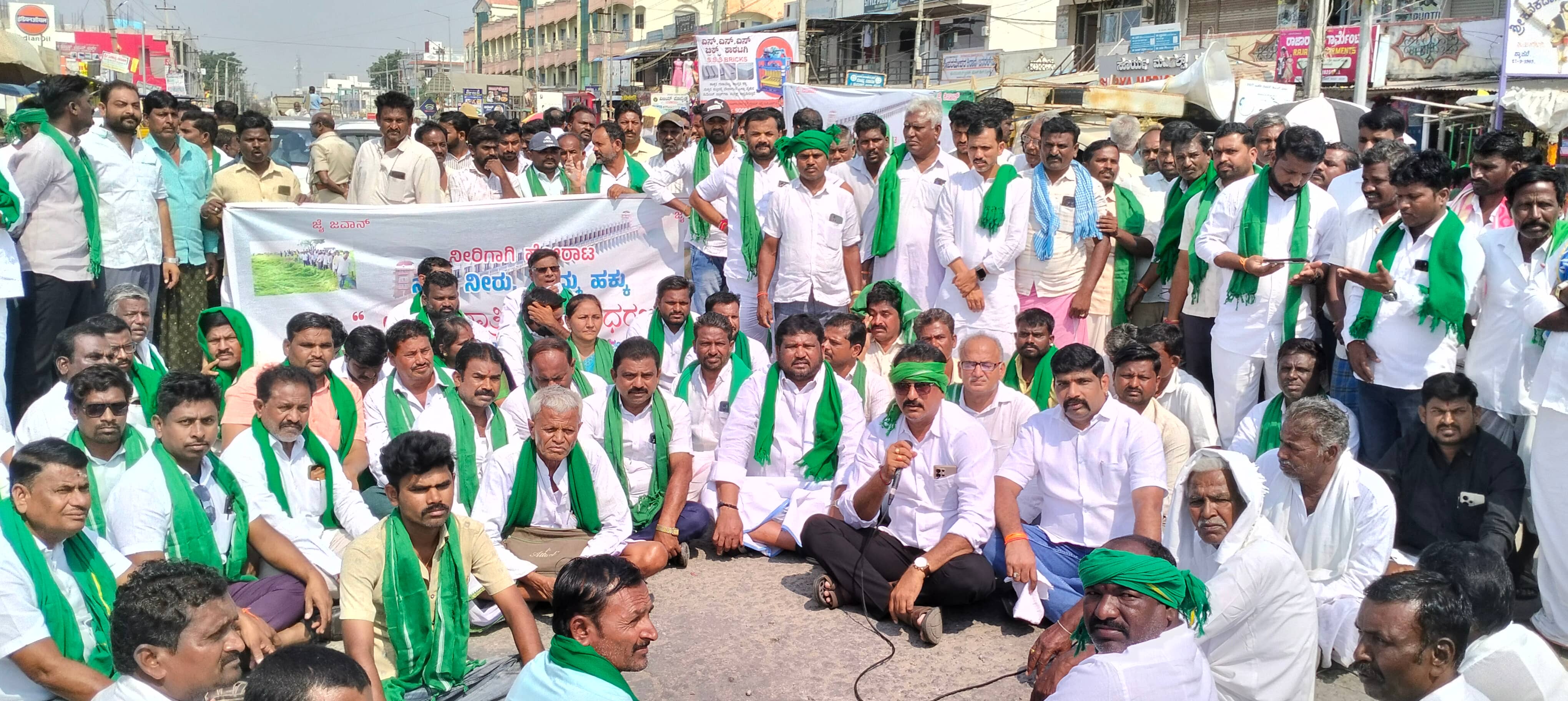 ಇಲ್ಲಿನ ವಿಶೇಷ ಎಪಿಎಂಸಿ ಆವರಣದ ಮುಂದೆ ಜಮಾವಣೆಗೊಂಡ ರೈತರು ಅಲ್ಲಿಂದ ಪ್ರತಿಭಟನಾ ಮೆರವಣಿಗೆ ಪ್ರಾರಂಭಿಸಿದರು. ಮೆರವಣಿಗೆ ಆರ್.ಜಿ. ರಸ್ತೆಯಲ್ಲಿ ಸಾಗಿ ಕನಕದಾಸ ವೃತ್ತದವರೆಗೆ ನಡೆಸಿ ಅಲ್ಲಿ ರಸ್ತೆಯಲ್ಲಿ ಕುಳಿತ ನೀರು ಬಿಡುಗಡೆಗೆ ಒತ್ತಾಯಿಸಿ ಸಾಂಕೇತಿಕವಾಗಿ ರಸ್ತೆ ತಡೆ ನಡೆಸಿದರು.ರಸ್ತೆ ಮೇಲೆ ಕುಳಿತ ಪ್ರತಿಭಟನಾಕಾರರ ಡಿಸಿಎಂ ಹಾಗೂ ನೀರಾವರಿ ಸಚಿವ ಡಿ.ಕೆ. ಶಿವಕುಮಾರ ಮತ್ತು ಜಿಲ್ಲಾ ಉಸ್ತುವಾರಿ ಸಚಿವ ಶಿವರಾಜ ತಂಗಡಗಿ ಮತ್ತು ರಾಜ್ಯ ಸರ್ಕಾರದ ವಿರುದ್ಧ ಧಿಕ್ಕಾರ ಕೂಗಿ 2 ನೇ ಬೆಳೆಗೆ ನೀರು ಬಿಡುಗಡೆ ಮಾಡಲೇಬೇಕು ಎಂದು ಘೋಷಣೆ ಕೂಗಿದರು.