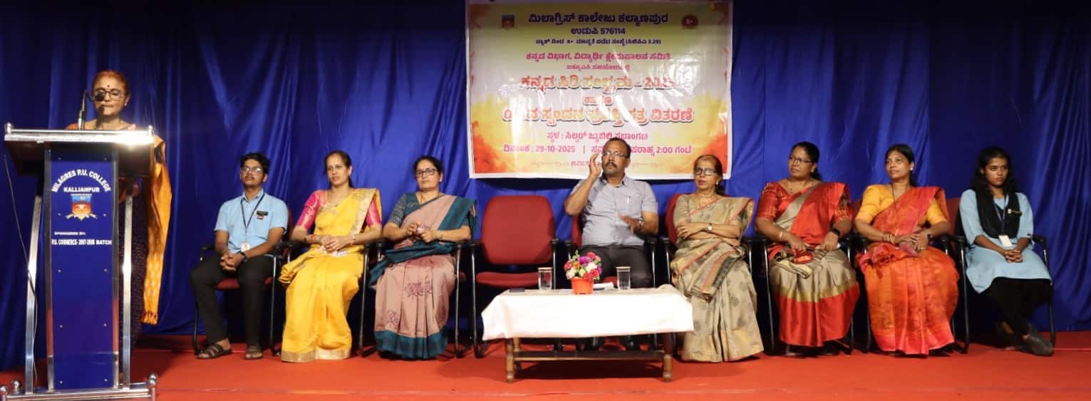 ಕಲ್ಯಾಣಪುರ: ಇಲ್ಲಿನ ಮಿಲಾಗ್ರಿಸ್ ಕಾಲೇಜಿನ ಕನ್ನಡ ವಿಭಾಗ, ವಿದ್ಯಾರ್ಥಿ ಕ್ಷೇಮಪಾಲನ ಸಮಿತಿ ಹಾಗೂ ಐಕ್ಯೂಎಸಿ ಸಹಯೋಗದಲ್ಲಿ ಕನ್ನಡ ರಾಜ್ಯೋತ್ಸವ ಪ್ರಯುಕ್ತ ‘ಸಿರಿ ಸಂಭ್ರಮ ೨೦೨೫’ ಹಾಗೂ ಯುವ ಚೇತನ ಪರೀಕ್ಷಾ ಪ್ರಮಾಣ ಪತ್ರ ವಿತರಣೆ ಕಾರ್ಯಕ್ರಮವನ್ನು ಕಾಲೇಜಿನ ಸಿಲ್ವರ್ ಜ್ಯುಬಿಲಿ ಸಭಾಂಗಣದಲ್ಲಿ ನಡೆಸಲಾಯಿತು.ಕಾಲೇಜಿನ ಅರ್ಥಶಾಸ್ತ್ರ ವಿಭಾಗದ ಪ್ರಾಧ್ಯಾಪಕಿ ಪೂರ್ಣಿಮಾ ಜಿ.ಎ. ಅವರು ರಾಜ್ಯೋತ್ಸವ ಸಂದೇಶದಲ್ಲಿ ಕನ್ನಡ ಭಾಷೆಯಲ್ಲಿ ಅಡಕಗೊಂಡಿರುವ ವೈಶಿಷ್ಟ್ಯವಾದ, ಭಿನ್ನಭಿನ್ನ ಸಂದರ್ಭಗಳಲ್ಲಿ ವಿಭಿನ್ನವಾದ ಅರ್ಥಗಳೊಂದಿಗೆ ಬಳಸಿಕೊಳ್ಳುವ ಸಾಮರ್ಥ್ಯ ಈ ಭಾಷೆಯ ಪದಗಳಿಗಿವೆ. ಭಾಷೆ ಹಾಗೂ ಸಂಸ್ಕೃತಿ ಜೊತೆಯಲ್ಲೇ ಬೆಳೆಯುತ್ತವೆ. ಕನ್ನಡ ಸಂಸ್ಕೃತಿ ಮೈಗೂಡಿಸಿಕೊಂಡು ಭಾಷೆ ಹಾಗೂ ಸಾಹಿತ್ಯವನ್ನು ಬೆಳೆಸುವ ಕೆಲಸಗಳು ಇಂದಿನ ಯುವಶಕ್ತಿಗಳಿಂದ ಆಗಬೇಕಾಗಿದೆ. ಪರಸ್ಪರ ಪ್ರೀತಿಯನ್ನು ಹಂಚಿಕೊಳ್ಳುವ ಮೂಲಕ ಸೌಹಾರ್ದತೆ ಬೆಳೆಯಬೇಕು ಎಂದು ಕರೆ ನೀಡಿದರು.