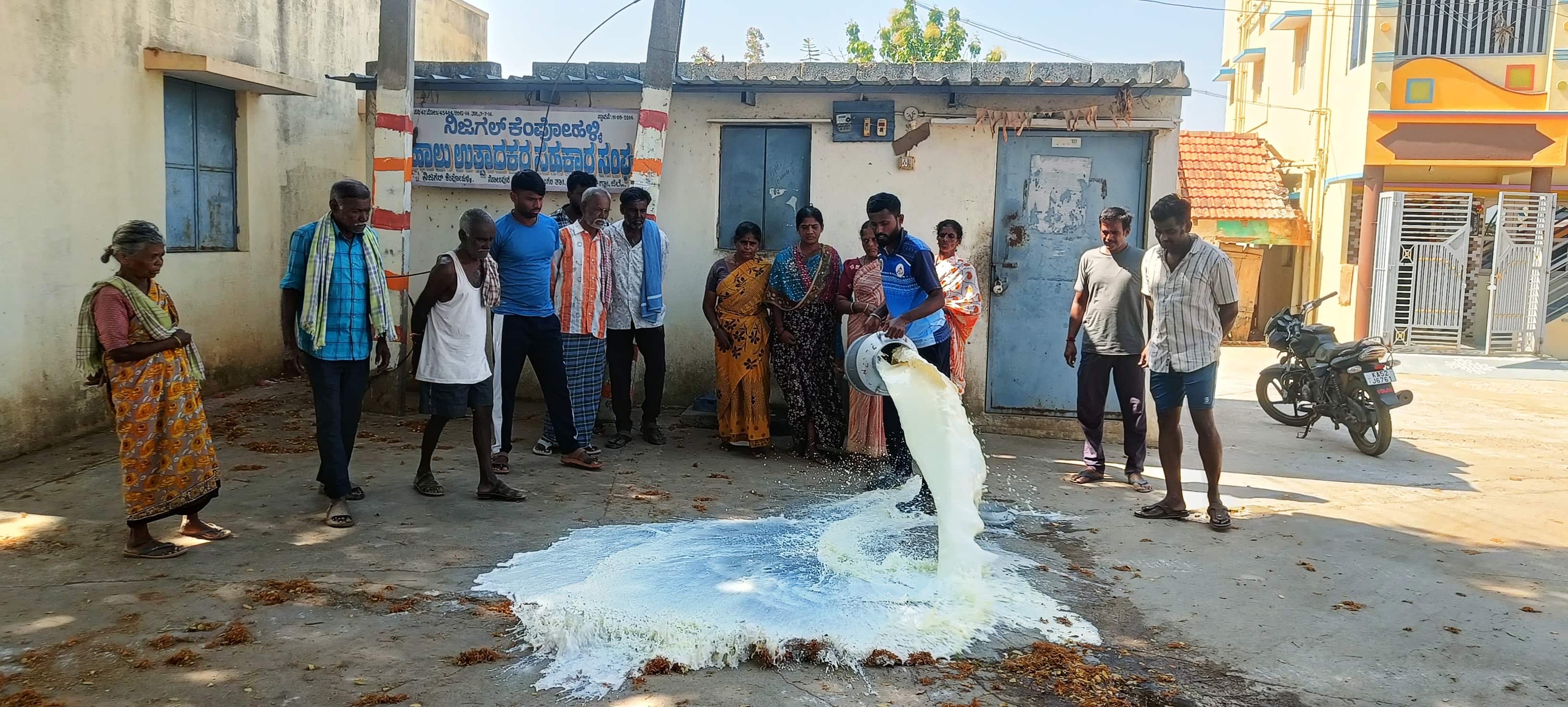ಸ್ಥಳಕ್ಕೆ ಬಾರದ ಡೈರಿ ಕಾರ್ಯದರ್ಶಿ:ರೈತರು ಪ್ರತಿಭಟನಾ ಸ್ಥಳಕ್ಕೆ ಡೈರಿ ಕಾರ್ಯದರ್ಶಿ ನಟರಾಜು ಬರಬೇಕೆಂದು ಆಗ್ರಹಿಸಿದರು. ಡೈರಿ ಅಧ್ಯಕ್ಷರು ಕರೆಸುತ್ತೇನೆಂದು ಸ್ಥಳದಲ್ಲೇ ಇದ್ದ ರೈತರಿಗೆ ತಿಳಿಸಿದರು. ಆದರೆ ಡೈರಿ ಕಾರ್ಯದರ್ಶಿ ಗ್ರಾಮದಲ್ಲೇ ಇದ್ದರೂ ಘಟನಾ ಸ್ಥಳಕ್ಕೆ ಬಾರದಿರುವುದು ಅನುಮಾನಕ್ಕೆ ಎಡೆಮಾಡಿಕೊಟ್ಟಿದೆ ಎಂದು ರೈತರು ಆರೋಪಿಸಿದರು.
