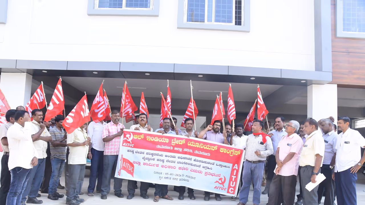 ಕನ್ನಡಪ್ರಭ ವಾರ್ತೆ, ತುಮಕೂರುಕನಿಷ್ಠ ವೇತನ ಎಂಬುದು ದಾನವಲ್ಲ ಅದು ಕಾರ್ಮಿಕರ ಶ್ರಮದ ಘನತೆಯನ್ನು ಕಾಪಾಡುವ ಸಂವಿಧಾನಿಕ. ಹಕ್ಕು 1992ರಲ್ಲಿ ಭಾರತದ ಸರ್ವೋಚ್ಛ ನ್ಯಾಯಾಲಯ ಐತಿಹಾಸಿಕ ರೆಪ್ಪಾ ಕೋಸ್ ಬ್ರೆಟ್ ತೀರ್ಪಿನಲ್ಲಿ ಕನಿಷ್ಠ ವೇತನ ಬದುಕಲು ಪೂರಕ ವೇತನ ಆಗಿರಬೇಕು ಎಂದು ಮಹತ್ವದ ತೀರ್ಪು ನೀಡಿದೆ ಎಂದು ಎಟಿಯುಸಿ ಜಿಲ್ಲಾಧ್ಯಕ್ಷ ಕಂಬೇಗೌಡ ತಿಳಿಸಿದರು ಅವರು ಕನಿಷ್ಠ ವೇತನ ಪರಿಷ್ಕರಣೆಯ ಅಂತಿಮ ಅಧಿಸೂಚನೆ ಹೊರಡಿಸುವಂತೆ ಹಾಗೂ ವೈಜ್ಞಾನಿಕ ಕನಿಷ್ಠ ವೇತನ ಜಾರಿಗೊಳಿಸುವಂತೆ ಆಗ್ರಹಿಸಿ ಎಐಟಿಯುಸಿ ಜಿಲ್ಲಾ ಮಂಡಳಿ ವತಿಯಿಂದ ಕಾರ್ಮಿಕ ಇಲಾಖೆಯ ಎದುರು ಹಮ್ಮಿಕೊಂಡಿದ್ದ ಪ್ರತಿಭಟನೆಯನ್ನು ಉದ್ದೇಶಿಸಿ ಮಾತನಾಡಿದರು. ಒಂದು ಕುಟುಂಬದಲ್ಲಿ ಮನುಷ್ಯ ಬದುಕು ನಡೆಸಲು ಅವಶ್ಯಕವಾದ ಆಹಾರ, ಉಡುಪು, ವಸತಿ ಶಿಕ್ಷಣ. ಆರೋಗ್ಯ ಇತ್ಯಾದಿಗಳಿಗೆ ಅಗತ್ಯವಾದಷ್ಟು ವೇತನ ದೊರಕಬೇಕೆಂದು ವೈಜ್ಞಾನಿಕವಾದ ಮಾರ್ಗಸೂಚಿಗಳನ್ನು ನೀಡಿದೆ ದುಡಿಯುವ ಪ್ರತಿಯೊಬ್ಬ ವ್ಯಕ್ತಿಗೆ 2700 ಕ್ಯಾಲೋರಿ ಪೌಷ್ಟಿಕಾಂಶ ವರ್ಷಕ್ಕೆ ಇಡೀ ಕುಟುಂಬಕ್ಕೆ 72ಗಜ ಬಟ್ಟೆ, ಮನೆಬಾಡಿಗೆ, ಇದೆಲ್ಲದೆ ಇಂಧನ ಮತ್ತು ಬೆಳಕಿನ ವ್ಯವಸ್ಥೆಗಾಗಿ ಶೇ.20ರಷ್ಟು ಹಾಗೂ ಮಕ್ಕಳ ಶಿಕ್ಷಣ ವೈದ್ಯಕೀಯ ಅವಶ್ಯಕತೆಗಳಿಗಾಗಿ ಶೇ.25ರಷ್ಟು ಸಂಭಾವನೆಯೂ ಕನಿಷ್ಟ ವೇತನದಲ್ಲಿ ಒಳಗೊಂಡಿರಬೇಕೆಂದು ನ್ಯಾಯಾಲಯವು ಸೂಚಿಸಿದೆ ಎಐಟಿಯುಸಿ ಕಾರ್ಯಧ್ಯಕ್ಷ ಗಿರೀಶ್ ಮಾತನಾಡಿ ತುಮಕೂರಿನ ಹೈಟೆಕ್ ಆಟೋಮೊಬೈಲ್ ಕಾರ್ಖಾನೆ ಕಾರ್ಮಿಕರಿಂದ ಹಿಡಿದು ಗ್ರಾಮೀಣ ತಾಲ್ಲೋಕುಗಳ ಗುಡಿ ಕೈಗಾರಿಕೆ ಆಧಾರಿತ ಅಗರಬತ್ತಿ ಬೀಡಿ ಕಾರ್ಮಿಕರವರೆಗೆ ಹಾಗೂ ಸ್ವಿಗ್ಗಿ ರೋಮ್ಯಾಟೊದಂತಹ ಗಿಗ್-ಎಕನಾಮಿ ಡೆಲವರಿ ಪಾರ್ಟ್ನರ್ ಗಳಿಂದ ಕನಿಷ್ಠವೇತನ ಪರಿಷ್ಠರಣೆಯ ಮೂಲಕ 1.77 ಕೋಟಿಗೂ ಹೆಚ್ಚು ಕುಟುಂಬಗಳು ಘನತೆ ಮತ್ತು ಗೌರವಯುತಜೀವನ ನಡೆಸಲು ಸಹಕಾರಿಯಾಗಲಿದೆ ಎಂದರು. ಎಐಟಿಯುಸಿ ಪ್ರಧಾನ ಕಾರ್ಯದರ್ಶಿ ಚಂದ್ರಶೇಖರ್ಜಿ ಮಾತನಾಡಿ ಏಪ್ರಿಲ್ 11.2025 ರ ಕರಡು ಕನಿಷ್ಟ ಕೂಲಿ ಅಧಿಸೂಚನೆಯನ್ನು ಕೂಡಲೇ ಅಂತಿಮ ಅಧಿಸೂಚನೆಯಾಗಿ ಪ್ರಕಟಿಸಿ, ಮೂರು ವರ್ಷಗಳ ವಿಳಂಭವನ್ನು ಸರಿದೂಗಿಸಲು ಪರಿಷ್ಕರಣೆಯು 2022 ರಿಂದ ಜಾರಿಗೆ ಬರುವಂತೆ ಪೂರ್ವಾನ್ವಯವಾಗಿ ಹಾರಿಗೊಳಿಸಿ, ತುಟ್ಟಿಭತ್ಯೆ ದರವನ್ನು ಪ್ರತಿ ಸೂಚ್ಯಂಕ ಪಾಯಿಂಟ್ ೮ ಪೈಸೆ ಹೆಚ್ಚಿಸಬೇಕು ಎಂದರು. ಪ್ರತಿಭಟನೆಯಲ್ಲಿ ಖಜಾಂಚಿ ರವಿಪ್ರಸಾದ್ ಸಿ.ಎ ಸೇರಿದಂತೆ ಮುಂತಾದವರು ಉಪಸ್ಥಿತರಿದ್ದರು.