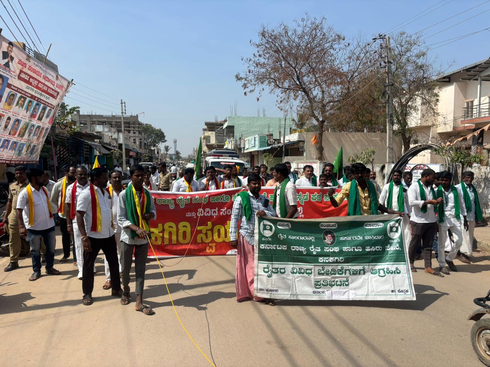 ಸರ್ಕಾರಿ ಆಸ್ಪತ್ರೆಯ ಹೇಮರೆಡ್ಡಿ ಮಲ್ಲಮ್ಮ ವೃತ್ತದಿಂದ ಆರಂಭಗೊಂಡ ಪ್ರತಿಭಟನಾ ಮೆರವಣಿಗೆಯಲ್ಲಿ ವಿವಿಧ ರೈತ ಸಂಘಟನೆಗಳ ಪದಾಧಿಕಾರಿಗಳು ಹಾಗೂ ಕರವೇ ಕಾರ್ಯಕರ್ತರು ಭಾಗಿಯಾಗಿದ್ದರು. ತೆಗ್ಗಿನಮನಿ ಓಣಿಯಿಂದ ಸಾಗಿದ ಹೋರಾಟ ಮೆಲುಗಡೆ ಅಗಸಿ ಹನುಮಪ್ಪ ದೇಗುಲದಿಂದ ರಾಜಬೀದಿಯ ಮಾರ್ಗವಾಗಿ ಹಳೇ ಪೊಲೀಸ್ ಠಾಣೆ, ಬಸ್ ನಿಲ್ದಾಣ ಮಾರ್ಗವಾಗಿ ವಾಲ್ಮೀಕಿ ವೃತ್ತದವರೆಗೆ ನಡೆಯಿತು.ರೈತ ಮುಖಂಡ ಗಣೇಶರೆಡ್ಡಿ ಮಾತನಾಡಿ ಶಿವರಾಜ ತಂಗಡಗಿ ಕನಕಗಿರಿ ಕ್ಷೇತ್ರದಿಂದ ಗೆದ್ದು ಸಚಿವರಾಗಿ ಎಂಟತ್ತು ವರ್ಷದಲ್ಲಿ ಕೆರೆ ತುಂಬಿಸಿದ್ದೀನಿ ಎಂಂದು ಹೇಳುವುದನ್ನು ಬಿಟ್ಟರೇ ಅಭಿವೃದ್ಧಿ ಶೂನ್ಯ. ಬೈಪಾಸ್ ಚರಂಡಿ ನಿರ್ಮಿಸಿ ತ್ರಿವೇಣಿ ಸಂಗಮ ಶುಚಿಗೊಳಿಸಬೇಕು. ಕನಕಗಿರಿ ಅಭಿವೃದ್ಧಿ ಪ್ರಾಧಿಕಾರ ಘೋಷಿಸಬೇಕು. ಪೂಜೆಗೆ ಸೀಮಿತವಾದ ತೋಟಗಾರಿಕೆ ಪಾರ್ಕ್ ನ್ನು ಅನುಷ್ಠಾಗೊಳಿಸುವುದು, ಪಪಂ ಹಾಗೂ ಗ್ರಾಪಂ ಕಚೇರಿಯಲ್ಲಿ ಫಾರಂ-3 ದಂಧೆಯನ್ನಾಗಿಸಿಕೊಂಡ ಅಧಿಕಾರಿ, ಸಿಬ್ಬಂದಿಯವರ ಮೇಲೆ ಕಾನೂನು ಕ್ರಮವಹಿಸುವುದು, ಹೆಚ್ಚಾಗುತ್ತಿರುವ ಕಳ್ಳತನದ ಪ್ರಕರಣ ನಿಯಂತ್ರಿಸುವುದು, ಪಟ್ಟಣದ ಸರ್ವೇ 3ರಲ್ಲಿ ಆಶ್ರಯ ಮನೆ ಯೋಜನೆಗಾಗಿ ಮೀಸಲಿಟ್ಟ ಜಾಗವು ಒತ್ತುವರಿಯಾಗಿದ್ದು, ಹಕ್ಕಪತ್ರ ನೀಡಿದ ಫಲಾನುಭವಿಗಳಿಗೆ ಹಂಚಿಕೆ ಮಾಡಬೇಕು. ಅಕ್ರಮ ಮದ್ಯದಂಗಡಿ ತೆರವುಗೊಳಿಸುವುದು, ಗ್ರಾಮೀಣ ಭಾಗದ ರಸ್ತೆ ದುರಸ್ಥಿಯಾಗಿದ್ದು, ಡಾಂಬರೀಕರಣಕ್ಕೆ ಮುಂದಾಗಬೇಕು. ಬಾಗಲಕೋಟೆ-ದರೋಜಿ ರೈಲು ಮಾರ್ಗ ಸರ್ವೇಗೆ ಸೀಮಿತವಾಗಿದ್ದು, ತ್ವರಿತವಾಗಿ ಕಾಮಗಾರಿ ಆರಂಭಿಸಲು ಕ್ರಮ ಕೈಗೊಳ್ಳಬೇಕು ಎಂದು ಸರ್ಕಾರವನ್ನು ಒತ್ತಾಯಿಸಿದರು.