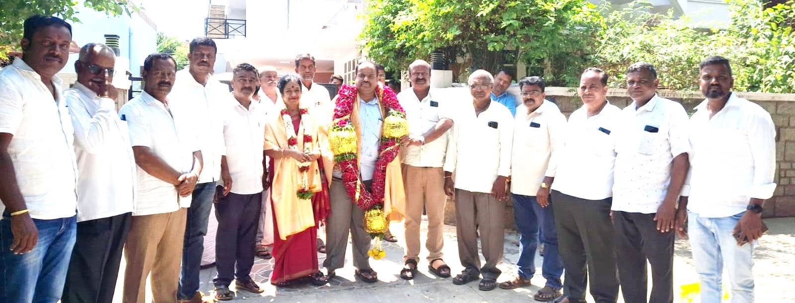 ಮೈಸೂರು ನಗರದ ದೇವಗೀತಾ ನಿವಾಸದಲ್ಲಿ ಶನಿವಾರ ಬೆಳಗ್ಗೆ ಶಾಸಕ, ಮಾಜಿ ಸಚಿವರಿಗೆ ದೊಡ್ಡ ಗಾತ್ರದ ಗುಲಾಬಿ ಹೂವಿನ ಹಾರ ಹಾಗೂ ಶಾಲು ಹೊದಿಸಿ, ಫಲ ತಾಂಬೂಲ ನೀಡಿ ಸನ್ಮಾನಿಸಿ, ಅಭಿನಂದಿಸಿದರು.