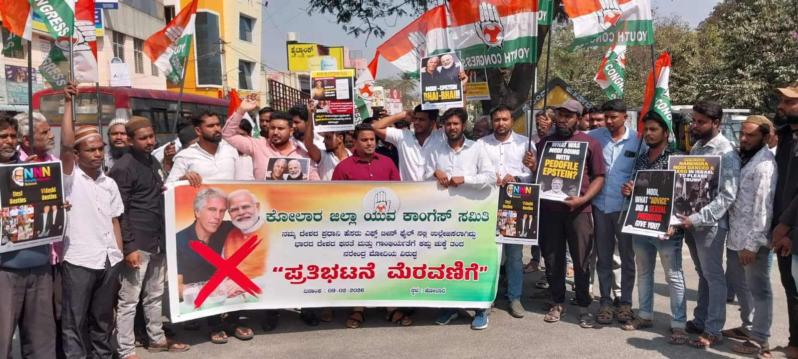 ಕನ್ನಡಪ್ರಭ ವಾರ್ತೆ ಕೋಲಾರದೇಶದ ಪ್ರಧಾನ ಮಂತ್ರಿ ನರೇಂದ್ರ ಮೋದಿ ಹೆಸರು ಎಪ್ಸ್ಟೀನ್ ಫೈಲ್ನಲ್ಲಿ ಉಲ್ಲೇಖಿಸಲಾಗಿದ್ದು, ದೇಶದ ಘನತೆ ಮತ್ತು ಗಾಂಭೀರ್ಯತೆಗೆ ಕಪ್ಪು ಚುಕ್ಕೆ ತಂದಿದ್ದಾರೆ, ಕೂಡಲೇ ರಾಜೀನಾಮೆ ಕೊಡಬೇಕು ಎಂದು ಒತ್ತಾಯಿಸಿ ಜಿಲ್ಲಾ ಯುವ ಕಾಂಗ್ರೆಸ್ ಪಕ್ಷದ ಅಧ್ಯಕ್ಷ ಆಫ್ರೀದ್ ನೇತೃತ್ವದಲ್ಲಿ ನಗರದ ಮೆಕ್ಕೆ ವೃತ್ತದಲ್ಲಿ ಪ್ರತಿಭಟನೆ ನಡೆಸಿದರು.ಆಫ್ರೀದ್ ಮಾತನಾಡಿ, ನಮ್ಮ ದೇಶದ ಪ್ರಧಾನಿ ನರೇಂದ್ರ ಮೋದಿ ಟ್ರಂಪ್ ಜೊತೆ ಮತ್ತು ಎಪ್ಸ್ಟೀನ್ ಜೊತೆ ಸಂಬಂಧ ಏನು ಅಂತ ಕೂಡಲೇ ಉತ್ತರ ಕೊಡಬೇಕು, ಪ್ರಧಾನಿ ಬೇರೆ ದೇಶದ ಅಧ್ಯಕ್ಷರ ಮುಂದೆ ಕುಣಿತಾರೆ ಅಂದ್ರೆ, ನಮ್ಮ ದೇಶಕ್ಕೆ ಅಗೌರವ ತಂದಿದ್ದಾರೆ. ಮೋದಿ ಬಂಡವಾಳಶಾಹಿ ಪರವಾಗಿದ್ದಾರೆ. ಅದಕ್ಕಾಗಿ ದೇಶವನ್ನು ಮಾರಾಟ ಮಾಡಲು ಸಂಚು ರೂಪಿಸಿದ್ದಾರೆ ಇದಕ್ಕೆ ಕಾಂಗ್ರೆಸ್ ಪಕ್ಷವು ಬಿಡುವುದಿಲ್ಲ ಎಂದರು.ಜಿಲ್ಲಾ ಉಪಾಧ್ಯಕ್ಷ ಸಾಧಿಕ್ ಮಾತನಾಡಿ, ಎಪ್ಸ್ಟೀನ್ ಎನ್ನುವ ಕಾಮಕ ಕಡಿಮೆ ವಯಸ್ಸಿನ ಮಕ್ಕಳಿಗೆ ಅತ್ಯಾಚಾರ ಮಾಡಿದವನು. ಅಂತವರ ಜೊತೆ ಮೋದಿ ಕೈ ಜೋಡಿಸ್ತಾರೆ ಅಂದ್ರೆ ನಮ್ಮ ದೇಶಕ್ಕೆ ತುಂಬಾ ಅವಮಾನ ಆಗುತ್ತದೆ. ಕೂಡಲೇ ಇದರ ಬಗ್ಗೆ ಉತ್ತರ ಕೊಡಬೇಕು ಇಲ್ಲದಿದ್ದರೆ ರಾಜೀನಾಮೆ ಕೊಡಬೇಕು ಎಂದು ಆಗ್ರಹಿಸಿದರು.ಪ್ರತಿಭಟನೆಯಲ್ಲಿ ಜಿಲ್ಲಾ ಯುವ ಕಾಂಗ್ರೆಸ್ ಪ್ರಧಾನ ಕಾರ್ಯದರ್ಶಿ ರಿಯಾಜ್ ಗೋರು, ಉಪಾಧ್ಯಕ್ಷ ತೌಫಿಕ್ ಅನ್ವರ್, ಕೋಲಾರ ತಾಲೂಕು ಅಧ್ಯಕ್ಷ ಸುಹೈಲ್, ಶ್ರೀನಿವಾಸಪುರ ಅಧ್ಯಕ್ಷ ಮನೋಹರ್, ಮುಳಬಾಗಿಲು ಅಧ್ಯಕ್ಷ ಸೂರಿ, ಕೋಲಾರ ನಗರ ಅಧ್ಯಕ್ಷ ಅರ್ಬಾಜ್, ಗ್ರಾಮಾಂತರ ಅಧ್ಯಕ್ಷ ಬರ್ಕತ್, ಅಭಿಷೇಕ್, ಯುವ ಮುಖಂಡರಾದ ಯತೀಶ್ ನಾಯ್ಡು,ಮನ್ಸೂರ್, ನೂರ್, ಬಾಬರ್ ಷಮ್ಸ್, ನಿಜಾಮುದ್ದೀನ್ ಇದ್ದರು.