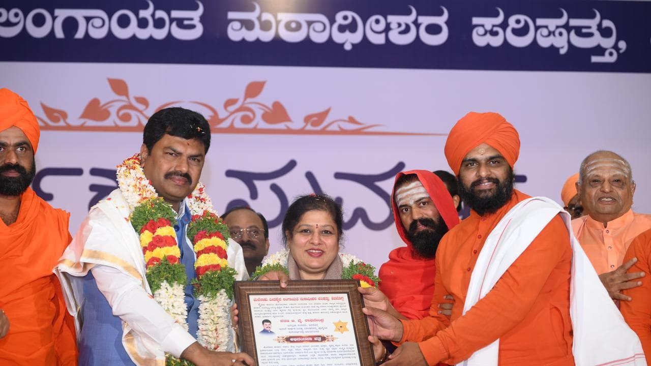 ಶಿವಮೊಗ್ಗ ನಗರದ ಸರ್ಜಿ ಕನ್ವೆನ್ಶನ್ ಹಾಲ್ನಲ್ಲಿ ಶುಕ್ರವಾರ ಸಾರ್ಥಕ ಸುವರ್ಣ ಶಿರೋನಾಮೆಯಡಿ ಮಲೆನಾಡು ವೀರಶೈವ ಲಿಂಗಾಯತ ಮಠಾಧೀಶರ ಪರಿಷತ್ತು ಹಮ್ಮಿಕೊಂಡಿದ್ದ ಸಮಾರಂಭದಲ್ಲಿ 50 ವಸಂತಗಳನ್ನು ಪೂರೈಸಿದ ಸಂಸದ ಬಿ.ವೈ. ರಾಘವೇಂದ್ರ ಅವರಿಗೆ ಪತ್ನಿ ತೇಜಸ್ವಿನಿ ಸಮೇತ ಅಭಿನಂದಿಸಲಾಯಿತು.
