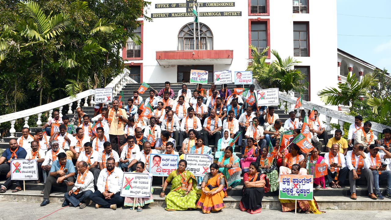-11ಎಸ್ಎಂಜಿಕೆಪಿ06:ಶಿವಮೊಗ್ಗದ ಜಿಲ್ಲಾಧಿಕಾರಿ ಕಚೇರಿ ಎದುರು ಸೋಮವಾರ ಕಾಂಗ್ರೆಸ್ ಸಂಸದ ಧೀರರಾಜ್ ಸಾಹು ಅವರನ್ನು ಬಂಧಿಸಬೇಕು ಎಂದು ಆಗ್ರಹಿಸಿ ಶಿವಮೊಗ್ಗ ಜಿಲ್ಲಾ ಬಿಜೆಪಿ ವತಿಯಿಂದ ಪ್ರತಿಭಟನೆ ನಡೆಯಿತು.