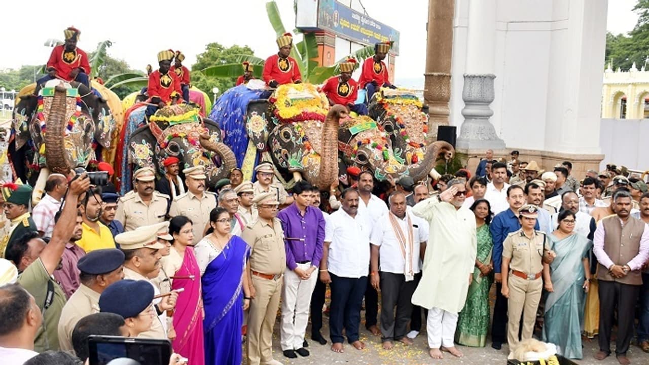 ಅಶೋಕಪುರಂನಲ್ಲಿರುವ ಅರಣ್ಯ ಭವನದಿಂದ ಅರಮನೆಯ ಜಯಮಾರ್ತಾಂಡ ದ್ವಾರಕ್ಕೆ ಅಂಬಾರಿ ಆನೆ ಅಭಿಮನ್ಯು ನೇತೃತ್ವದಲ್ಲಿ 9 ಆನೆಗಳು ಆಗಮಿಸಿದವು. ಇವುಗಳಿಗೆ ಅರ್ಚಕ ಪ್ರಹ್ಲಾದ್ ರಾವ್ ಪೂಜೆ ಸಲ್ಲಿಸಿದರು. ಬಳಿಕ ಶಾಸಕರಾದ ಟಿ.ಎಸ್.ಶ್ರೀವತ್ಸ, ಕೆ.ಹರೀಶ್ ಗೌಡ, ತನ್ವೀರ್ ಸೇಠ್ ಅವರು ಪುಷ್ಪಾರ್ಚನೆ ಮಾಡಿ, ಅರಮನೆ ಆವರಣಕ್ಕೆ ಆನೆಗಳನ್ನು ಬರ ಮಾಡಿಕೊಂಡರು. ದಸರಾ ಆನೆಗಳು ಅರಮನೆ ಆವರಣ ಪ್ರವೇಶಿಸುತ್ತಿದ್ದಂತೆ ಸಿಎಆರ್ ಪೊಲೀಸರು ಗೌರವ ರಕ್ಷೆ ಸಲ್ಲಿಸಿದರು.