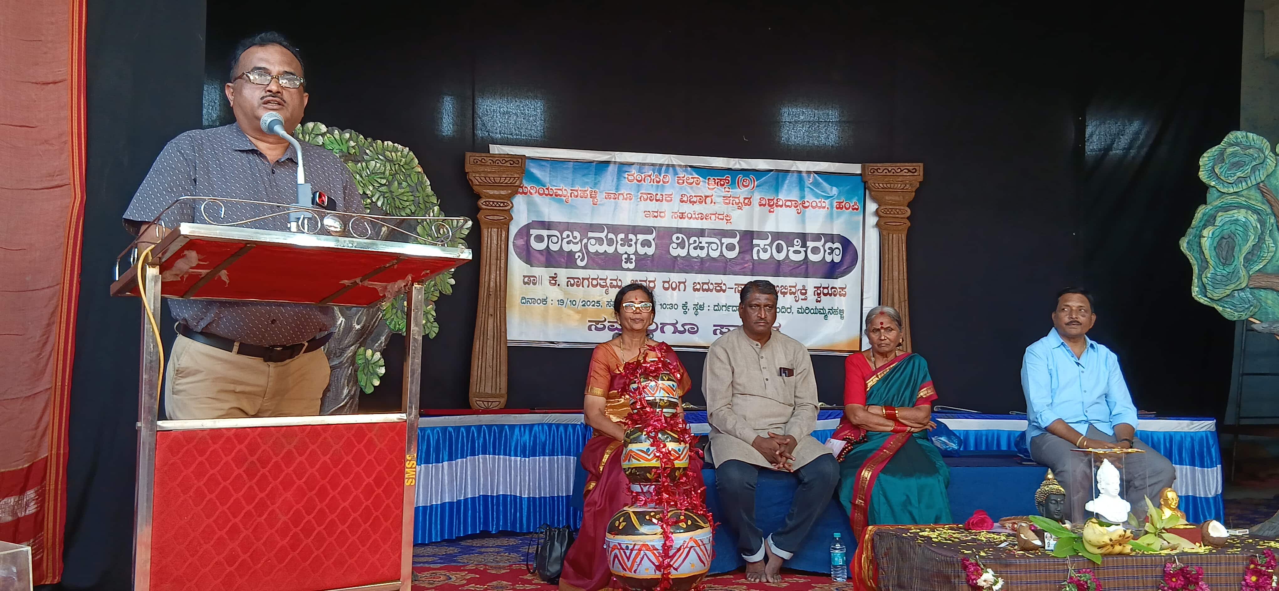 ಇಲ್ಲಿನ ದುರ್ಗಾದಾಸ್ ಕಲಾಮಂದಿರದಲ್ಲಿ ಇಲ್ಲಿನ ರಂಗಸಿರಿ ಕಲಾ ಟ್ರಸ್ಟ್ ಹಾಗೂ ಹಂಪಿ ಕನ್ನಡ ವಿಶ್ವವಿದ್ಯಾಲಯ ನಾಟಕ ವಿಭಾಗ ಇವರ ಸಹಯೋಗದಲ್ಲಿ ಭಾನುವಾರ ನಡೆದ ಒಂದು ದಿನದ ರಾಜ್ಯಮಟ್ಟದ ವಿಚಾರ ಸಂಕಿರಣ ಡಾ.ಕೆ. ನಾಗರತ್ನಮ್ಮ ಅವರ ರಂಗ ಬದುಕು- ಸಾಧನೆ ಅಭಿವೃದ್ಧಿಯ ಸ್ವರೂಪ ಕುರಿತು ನಡೆದ ವಿಚಾರ ಸಂಕಿರಣ ಉದ್ಘಾಟಿಸಿ ಅವರು ಮಾತನಾಡಿದರು.ಡಾ.ಕೆ.ನಾಗರತ್ನಮ್ಮ ಗ್ರಾಮೀಣ ರಂಗಭೂಮಿಯ ಬಹುದೊಡ್ಡ ಪ್ರತಿಭಾವಂತ ಕಲಾವಿದೆ. ಅವರ ಕಲೆ ಮತ್ತು ಸಾಧನೆಯ ಕುರಿತು ವಿದ್ಯಾರ್ಥಿಗಳಿಗೆ ಗ್ರಾಮಾಂತರ ರಂಗಭೂಮಿ ಬದುಕು ಮತ್ತು ಸಾಧನೆ- ಅಭಿವ್ಯಕ್ತಿ ಸ್ವರೂಪ ಕುರಿತು ಪರಿಯಿಸಲು ವಿಶ್ವವಿದ್ಯಾಲಯದ ಪಠ್ಯದಲ್ಲಿ ಅವರ ಜೀವನ ಚಿರಿತ್ರೆಯ ಪಾಠ ಅಳವಡಿಸಬೇಕು ಎಂದು ಅವರು ಹೇಳಿದರು.