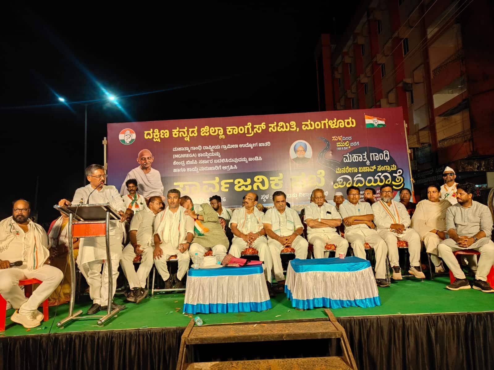 ದ.ಕ.ಜಿಲ್ಲಾ ಕಾಂಗ್ರೆಸ್ ಸಮಿತಿ ನೇತೃತ್ವದಲ್ಲಿ ಮಹಾತ್ಮ ಗಾಂಧಿ ರಾಷ್ಟ್ರೀಯ ಗ್ರಾಮೀಣ ಉದ್ಯೋಗ ಖಾತರಿ ಕಾಯ್ದೆಯನ್ನು ಬದಲಿಸಿರುವುದನ್ನು ಖಂಡಿಸಿ ಹಾಗೂ ಕಾಯ್ದೆ ಮರು ಜಾರಿಗೆ ಆಗ್ರಹಿಸಿ ಸುಳ್ಯದಿಂದ ಮೂಲ್ಕಿವರೆಗೆ ಜರಗಿದ ಮನರೇಗಾ ಬಚಾವ್ ಸಂಗ್ರಾಮ 100 ಕಿ .ಮಿ.ಪಾದಯಾತ್ರೆ ಸಮಾರೋಪದಲ್ಲಿ ಮಾತನಾಡಿದರು.ಪ್ರಧಾನಿ ಮೋದಿಯವರ ಜನಪ್ರಿಯತೆ ಕುಸಿಯುತ್ತಿದೆ. ಸರ್ವಾಧಿಕಾರಿ ಧೋರಣೆಯಿಂದ ಜನರು ಬೇಸತ್ತಿದ್ದು ಇ ಡಿ, ಚುನಾವಣಾ ಆಯೋಗ, ಸಿಬಿಐ ಸೇರಿದಂತೆ ಎಲ್ಲ ಸಂವಿಧಾನಿಕ ಸಂಸ್ಥೆಗಳನ್ನು ಕೇಂದ್ರ ದುರುಪಯೋಗಪಡಿಸಿಕೊಳ್ಳುತ್ತಿದೆ. ಚಿನ್ನ, ಬೆಳ್ಳಿ, ದಿನಸಿ ವಸ್ತುಗಳ ಬೆಲೆ ಏರಿಕೆಯಿಂದ ಜನ ಸಾಮಾನ್ಯರಿಗೆ ಬದುಕಲು ಅಸಾಧ್ಯ ಸ್ಥಿತಿಯಿದೆ. 2014ರವರೆಗೆ ದೇಶದ ಸಾಲ 52 ಲಕ್ಷ ಕೋಟಿ ಇದ್ದು ಈ ಬಾರಿಯ ಬಜೆಟ್ ನಲ್ಲಿ 21695,000 ಕೋಟಿಯಾಗಿದ್ದು ಜನರನ್ನು ಸಾಲದ ಸುಳಿಗೆ ಸಿಲುಕಿಸಲಾಗುತ್ತಿದೆ ಎಂದರು.
