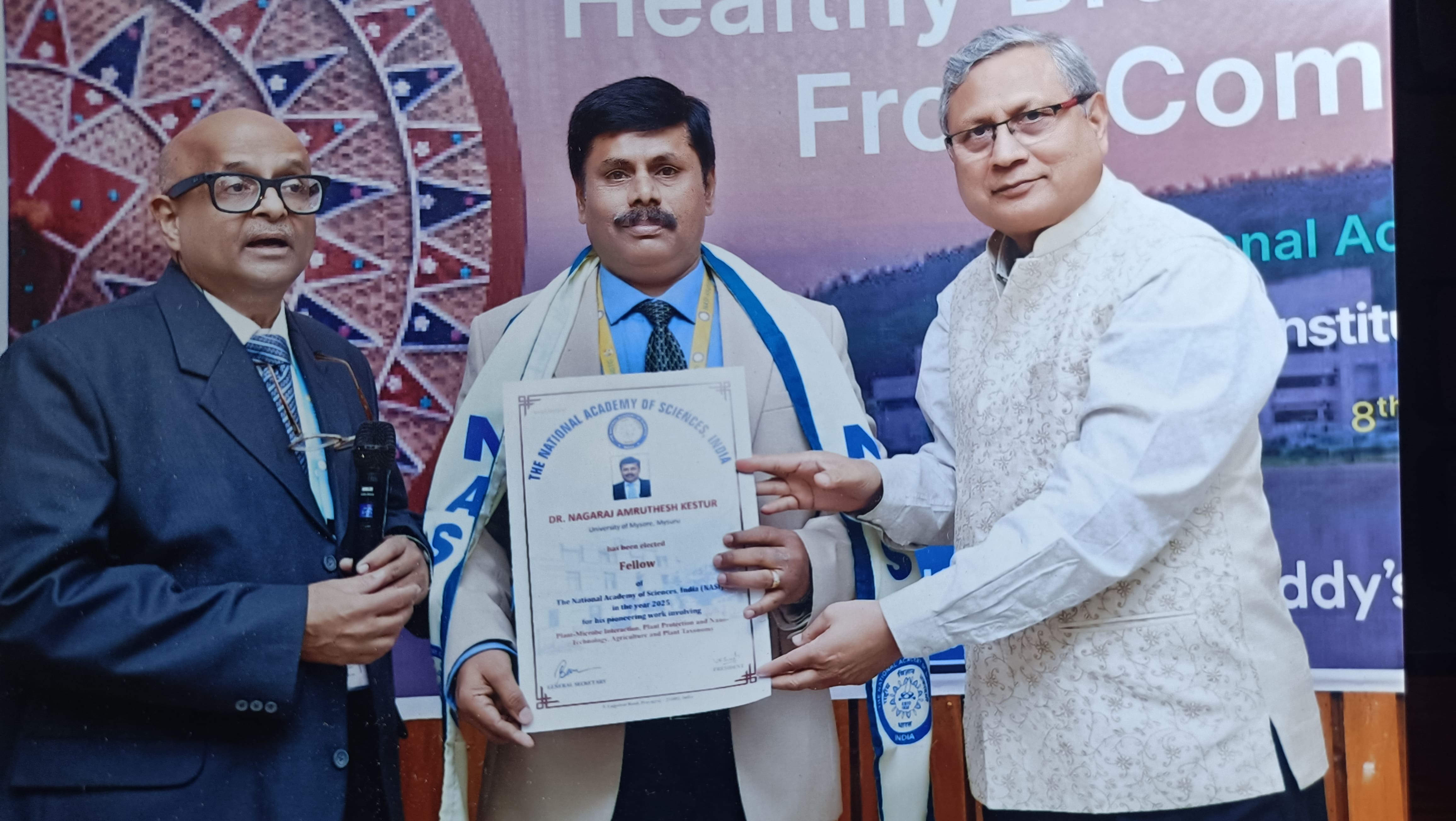 ಮೈಸೂರು ವಿಶ್ವವಿದ್ಯಾಲಯದ ಸಸ್ಯಶಾಸ್ತ್ರ ಅಧ್ಯಯನ ವಿಭಾಗದ ಪ್ರಾಧ್ಯಾಪಕ ಡಾ.ಕೆ.ಎನ್.ಅಮೃತೇಶ್ ಅವರಿಗೆ ಭಾರತದ ಪ್ರತಿಷ್ಠಿತ ರಾಷ್ಟ್ರೀಯ ವಿಜ್ಞಾನ ಅಕಾಡೆಮಿ ಕೊಡಮಾಡುವ (ಎಫ್ಎನ್ಎಎಸ್ಸಿ) ಗೌರವಕ್ಕೆ ಭಾಜನರಾಗಿದ್ದಾರೆ.ಭಾರತೀಯ ತಂತ್ರಜ್ಞಾನ ಸಂಸ್ಥೆ ಅಸ್ಸಾಂನ ಗುವಾಹಟಿಯಲ್ಲಿ ನಡೆದ ರಾಷ್ಟ್ರೀಯ ಸಮಾವೇಶದಲ್ಲಿ ನ್ಯಾಷನಲ್ ಅಕಾಡೆಮಿ ಆಫ್ ಸೈನ್ಸಸ್ ಇಂಡಿಯಾ ಅಧ್ಯಕ್ಷ ಪ್ರೊ.ವಿನೋದ್ ಕೆ.ಸಿಂಗ್ ಅವರು ಡಾ.ಕೆ.ಎನ್.ಅಮೃತೇಶ್ ಅವರನ್ನು ಸನ್ಮಾನಿಸಿ ಪ್ರಶಸ್ತಿ ಪ್ರದಾನ ಮಾಡಿದರು. ಈ ಪ್ರಶಸ್ತಿಯು ಪ್ರಮಾಣಪತ್ರ, ಭಿನ್ನವತ್ತಳೆ, ಪದಕ ಮತ್ತು ಫೆಲೋಶಿಪ್ ಪಿನ್ಗಳನ್ನು ಒಳಗೊಂಡಿದೆ. ಈ ಗೌರವವು ಕೃಷಿ ಮತ್ತು ಸಸ್ಯ ವಿಜ್ಞಾನಕ್ಕೆ ಅಮೃತೇಶ್ ನೀಡಿರುವ ಮಹತ್ವದ ಕೊಡುಗೆಗೆ ಸಂದಿದೆ.