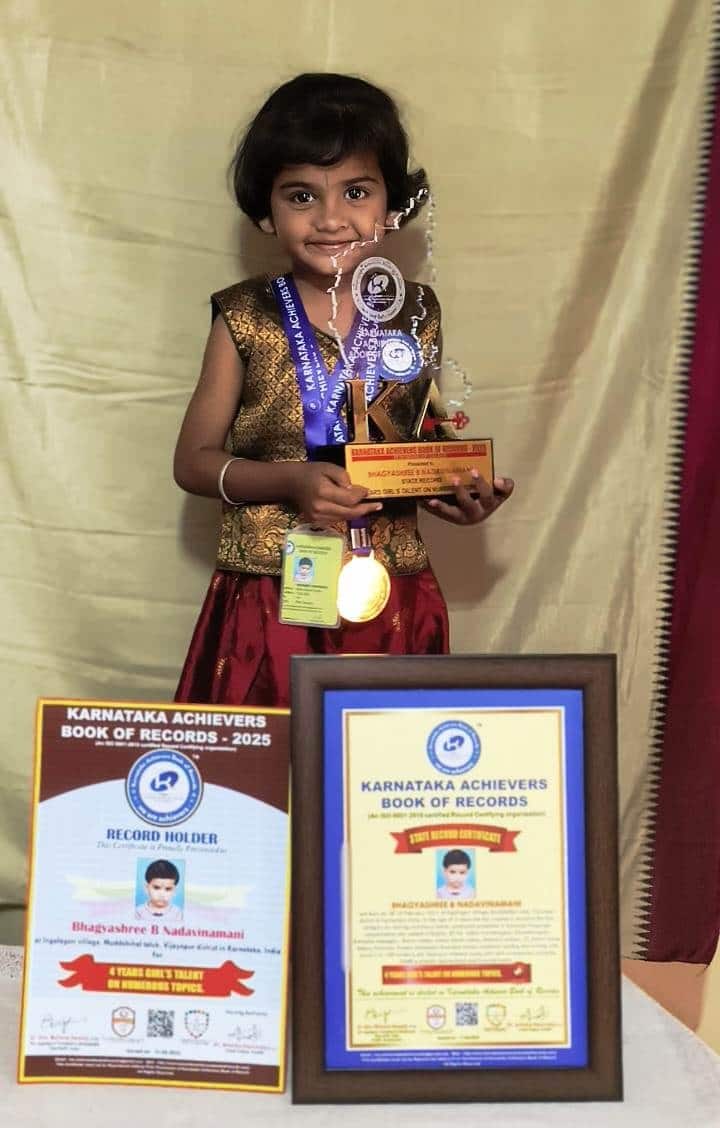 ಸಮೀಪದ ಇಂಗಳಗೇರಿ ಗ್ರಾಮದ 4 ವರ್ಷದ ಬಾಲಕಿ ಭಾಗ್ಯಶ್ರೀ ನಾಡವಿನಮನಿ ತನ್ನ ವಿಶಿಷ್ಟ ಪ್ರತಿಭೆ ಮೂಲಕ ಎಲ್ಲರ ಗಮನ ಸೆಳೆದಿದ್ದಾರೆ. ಭಾಗ್ಯಶ್ರೀ ಈ ಸಾಧನೆ ಗುರುತಿಸಿ ಕರ್ನಾಟಕ ಅಚೀವರ್ಸ್ ಬುಕ್ ಆಫ್ ರೆಕಾರ್ಡ್ಸ್ ಸಂಸ್ಥೆಯು ಇತ್ತೀಚೆಗೆ ಬೆಂಗಳೂರಿನ ರವಿಂದ್ರ ಕಲಾ ಕ್ಷೇತ್ರದಲ್ಲಿ ನ್ಯಾಷನಲ್ ಅಚೀವರ್ಸ್ ಅವಾರ್ಡ್ ನೀಡಿ ಗೌರವಿಸಿದೆ.