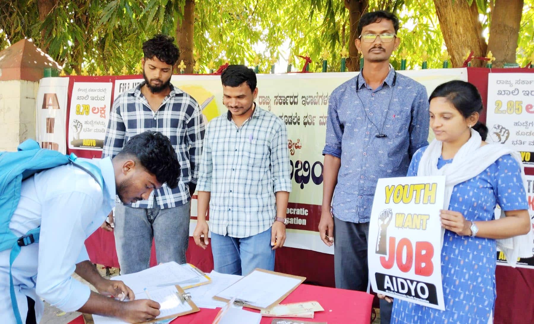 ಕೇಂದ್ರ ಮತ್ತು ರಾಜ್ಯ ಸರ್ಕಾರಗಳ ಎಲ್ಲಾ ಖಾಲಿ ಹುದ್ದೆಗಳ ಭರ್ತಿ ಮಾಡಲು, ನೇಮಕಾತಿಯಲ್ಲಿನ ಅಕ್ರಮಗಳನ್ನು ತಡೆಗಟ್ಟಲು ಆಗ್ರಹಿಸಿ ದೇಶ ವ್ಯಾಪಿ ಸಹಿಸಂಗ್ರಹ ಅಭಿಯಾನ ಹಿನ್ನೆಲೆಯಲ್ಲಿ ಅರಮನೆ ಕೋಟೆ ಆಂಜನೇಯಸ್ವಾಮಿ ದೇವಸ್ಥಾನದ ಹತ್ತಿರ ಆಲ್ ಇಂಡಿಯಾ ಡೆಮಾಕ್ರೆಟಿಕ್ ಯೂತ್ ಆರ್ಗನೈಸೇಷನ್ (ಎಐಡಿವೈಒ) ಜಿಲ್ಲಾ ಸಮಿತಿಯವರು ಗುರುವಾರ ಸಹಿಸಂಗ್ರಹ ಅಭಿಯಾನ ಹಮ್ಮಿಕೊಂಡಿದ್ದರು.ದೇಶದಲ್ಲಿ ಹೆಚ್ಚುತ್ತಿರುವ ನಿರುದ್ಯೋಗ ಸಮಸ್ಯೆ ಭಯನಕ ರೂಪವನ್ನು ಪಡೆದುಕೊಂಡಿದೆ. ಕೇಂದ್ರ ಸರ್ಕಾರದ 78 ಸಚಿವಾಲಯಗಳು ಮತ್ತು ಇಲಾಖೆಗಳಲ್ಲಿ 9.78 ಲಕ್ಷಕ್ಕೂ ಹೆಚ್ಚು ಹುದ್ದೆಗಳು ಖಾಲಿ ಇವೆ. ಕರ್ನಾಟಕ ರಾಜ್ಯ ಸರ್ಕಾರದ ಇಲಾಖೆಗಳಲ್ಲೂ ಸಹ 2.85 ಲಕ್ಷ ಹುದ್ದೆಗಳು ಖಾಲಿ ಇವೆ ಎಂದು ಅವರು ತಿಳಿಸಿದರು.ಹೀಗಾಗಿ, ಕೇಂದ್ರ ಮತ್ತು ರಾಜ್ಯ ಸರ್ಕಾರಗಳಲ್ಲಿ ಖಾಲಿ ಇರುವ ಎಲ್ಲಾ ಹುದ್ದೆಗಳನ್ನು ತಕ್ಷಣವೇ ಭರ್ತಿ ಮಾಡಬೇಕು ಮತ್ತು ಹೊಸ ಉದ್ಯೋಗಗಳನ್ನು ಸೃಷ್ಟಿಸಬೇಕು. ಎಲ್ಲಾ ನೇಮಕಾತಿಗಳ ವಯೋಮಿತಿಯಲ್ಲಿ ಕನಿಷ್ಠ 5 ವರ್ಷಗಳ ಸಡಿಲಿಕೆ ನೀಡಬೇಕು. ಎಲ್ಲಾ ರೀತಿಯ ನೇಮಕಾತಿ ಪ್ರಕ್ರಿಯೆಯಲ್ಲಿ ಸಂಪೂರ್ಣ ಪಾರದರ್ಶಕತೆ ಇರಬೇಕು. ಪರೀಕ್ಷಾ ಅಕ್ರಮಗಳನ್ನು ತಡೆಗಟ್ಟಬೇಕು ಎಂದು ಅವರು ಒತ್ತಾಯಿಸಿದರು.ಕೆಪಿಎಸ್ಸಿಯಲ್ಲಿನ ಅಕ್ರಮ ತಡೆಗಟ್ಟಲು ರಾಜ್ಯ ಸರ್ಕಾರ ಹೋಟಾ ಸಮಿತಿ ಶಿಫಾರಸುಗಳನ್ನು ಜಾರಿಗೊಳಿಸಬೇಕು. ಗುತ್ತಿಗೆ ವ್ಯವಸ್ಥೆಯನ್ನು ರದ್ದುಗೊಳಿಸಬೇಕು ಮತ್ತು ಎಲ್ಲಾ ಹುದ್ದೆಗಳಿಗೂ ಕಾಯಂ ನೇಮಕಾತಿ ಮಾಡಬೇಕು. ದೇಶಾದ್ಯಂತ ಗಿಗ್ ಕಾರ್ಮಿಕರಿಗೆ ಕಾರ್ಮಿಕರೆಂದು ಪರಿಗಣಿಸಿ ಮತ್ತು ಕನಿಷ್ಠ ವೇತನ ಮತ್ತು ಸಾಮಾಜಿಕ ಭದ್ರತೆಯನ್ನು ಖಚಿತಪಡಿಸಬೇಕು ಎಂದು ಅವರು ಆಗ್ರಹಿಸಿದರು.ಉದ್ಯೋಗಾವಕಾಶ ದೊರೆಯುವವರೆಗೆ ಗೌರವಾನ್ವಿತ ಜೀವನ ನಡೆಸಲು ಸೂಕ್ತವಾದ ನಿರುದ್ಯೋಗ ಭತ್ಯೆ ನೀಡಬೇಕು. ಸರ್ಕಾರಿ ಸಂಸ್ಥೆಗಳ ಖಾಸಗೀಕರಣ ನೀತಿಯನ್ನು ರದ್ದುಗೊಳಿಸಬೇಕು. ನೇಮಕಾತಿಗಳಲ್ಲಿ ದುಬಾರಿ ಪರೀಕ್ಷಾ ಶುಲ್ಕ ಕೈಬಿಡಬೇಕು ಹಾಗೂ ಪರೀಕ್ಷಾರ್ಥಿಗಳಿಗೆ ಉಚಿತ ಸಾರಿಗೆ ವ್ಯವಸ್ಥೆ ಕಲ್ಪಿಸಬೇಕು ಎಂದು ಅವರು ಒತ್ತಾಯಿಸಿದರು.ಈ ಅಭಿಯಾನದಲ್ಲಿ ಯುವಜನರು ಹಾಗೂ ಸಾರ್ವಜನಿಕರು ತಮ್ಮ ಸಹಿ ಹಾಕುವುದರ ಮೂಲಕ ತಮ್ಮ ಸಂಪೂರ್ಣ ಬೆಂಬಲವನ್ನು ವ್ಯಕ್ತಪಡಿಸಿದರು.ಈ ವೇಳೆ ಎಐಡಿವೈಒ ಜಿಲ್ಲಾಧ್ಯಕ್ಷ ಟಿ.ಆರ್. ಸುನಿಲ್, ಜಂಟಿ ಕಾರ್ಯದರ್ಶಿ ನೀತುಶ್ರೀ, ಸದಸ್ಯರಾದ ರಣಜಿತ್, ಪೂರ್ಣಿಮಾ ಇದ್ದರು.)