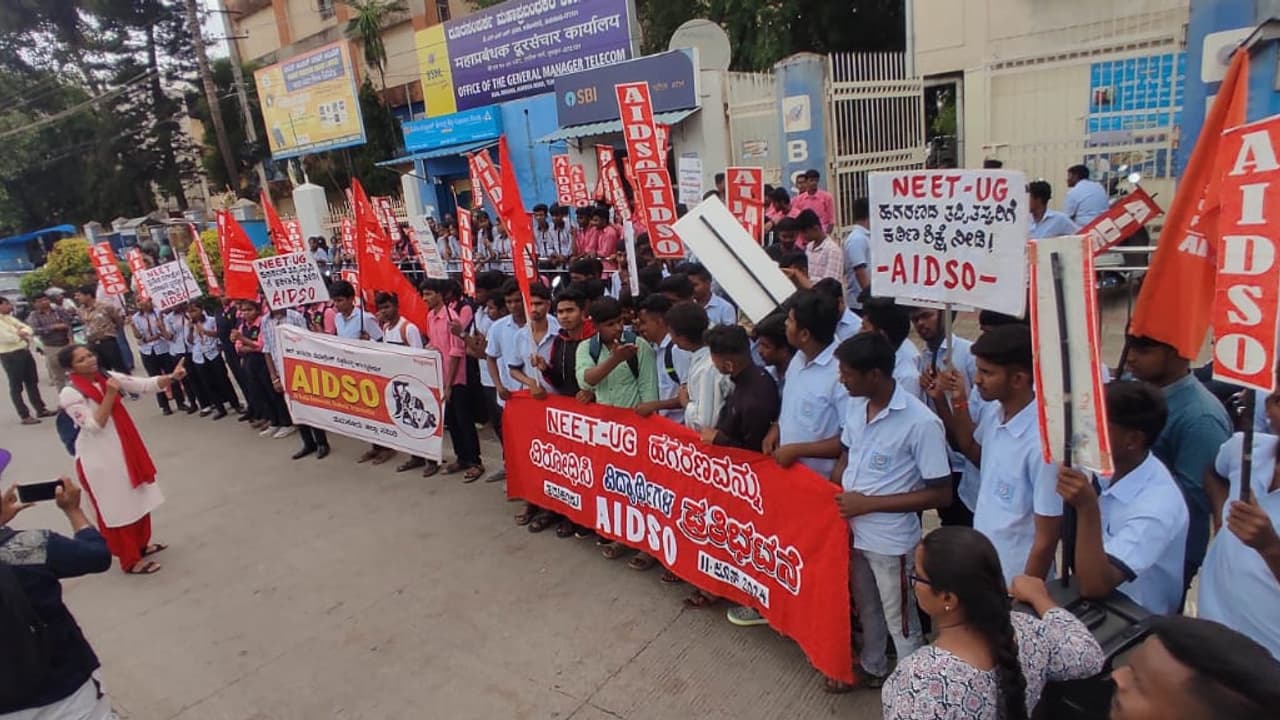 ನೀಟ್ ಪರೀಕ್ಷೆಯಲ್ಲಿ ಭ್ರಷ್ಟಾಚಾರ ನಡೆದಿದೆ ಎಂದು ಆರೋಪಿಸಿ ಎಐಡಿಎಸ್ಒ ವಿದ್ಯಾರ್ಥಿ ಸಂಘಟನೆ ನೇತೃತ್ವದಲ್ಲಿ ನಗರದ ಟೌನ್ ಹಾಲ್ ವೃತ್ತದಿಂದ ಬಿಎಸ್ಎನ್ಎಲ್ ಕಚೇರಿಯವರೆಗೆ ಮೆರವಣಿಗೆ ಮೂಲಕ ತೆರಳಿ ಪ್ರತಿಭಟನೆ ಮಾಡಲಾಯಿತು.