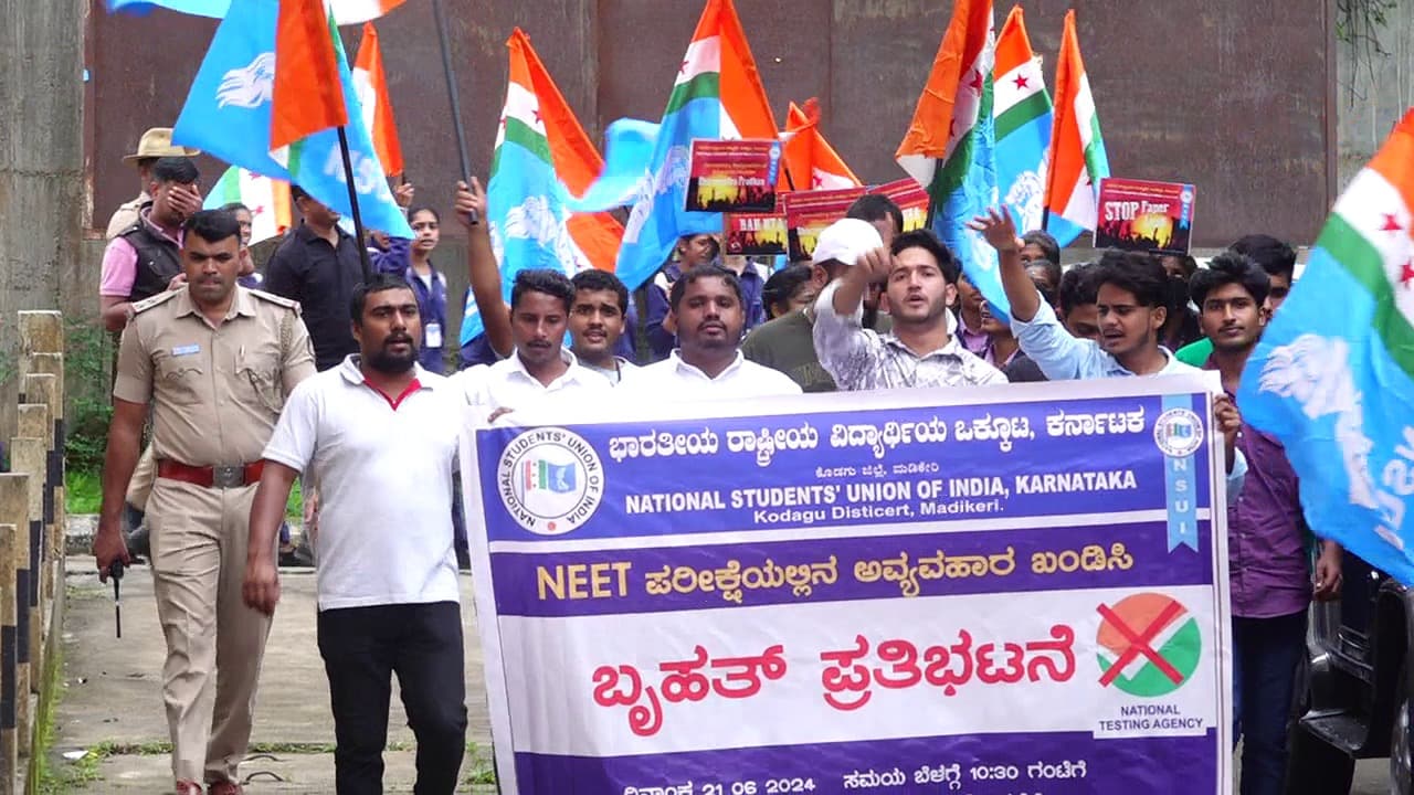 ನೀಟ್ ಪರೀಕ್ಷೆಯಲ್ಲಿ ಅಕ್ರಮ ನಡೆದಿರುವ ಬಗ್ಗೆ ಶಂಕೆ ಇದ್ದು, ಉನ್ನತ ಮಟ್ಟದ ತನಿಖೆ ನಡೆಸಬೇಕು ಮತ್ತು ಮರು ಪರೀಕ್ಷೆಯಾಗಬೇಕು ಎಂದು ಒತ್ತಾಯಿಸಿ ಭಾರತೀಯ ರಾಷ್ಟ್ರೀಯ ವಿದ್ಯಾರ್ಥಿ ಒಕ್ಕೂಟ ಮಡಿಕೇರಿ ನಗರದಲ್ಲಿ ಪ್ರತಿಭಟನೆ ನಡೆಸಿತು. ನಗರದ ಇಂದಿರಾಗಾಂಧಿ ವೃತ್ತದಿಂದ ಮೆರವಣಿಗೆ ಮೂಲಕ ಪ್ರತಿಭಟನಾಕಾರರು ಸಾಗಿದರು.