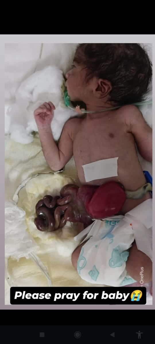 ಕುಕನೂರು ತಾಲೂಕಿನ ಬೂದಗುಂಪಾದ ಮಲ್ಲಪ್ಪ- ವಿಜಯಲಕ್ಷ್ಮೀ ದಂಪತಿ ಮಗು ಇದು. ವೈದ್ಯಾಧಿಕಾರಿಗಳು ಗರ್ಭಾವಸ್ಥೆಯಲ್ಲಿಯೇ ಮಗುವಿಗೆ ತೊಂದರೆ ಇದೆ ಎಂದಿದ್ದಾರೆ. ಸರ್ಕಾರಿ ಆಸ್ಪತ್ರೆಯಲ್ಲಿ ಈ ಮಗು ಜನಿಸಿದ್ದು, ಅದರ ಕರುಳು ಹೊರಗೆ ಇದ್ದದ್ದು ವೈದ್ಯರನ್ನು ಆಶ್ಚರ್ಯ ಚಕಿತರನ್ನಾಗಿಸಿದೆ. ವೈದ್ಯರು ಕೂಡಲೇ ಆ ಮಗುವನ್ನು ಕೊಪ್ಪಳ ಜಿಲ್ಲಾಸ್ಪತ್ರೆಗೆ ದಾಖಲಿಸಿದ್ದಾರೆ. ಮಗು ಉಸಿರಾಟದ ತೊಂದರೆ ಅನುಭವಿಸುತ್ತಿದೆ. ಭಾನುವಾರ ಹುಬ್ಬಳ್ಳಿ ಕಿಮ್ಸ್ ಆಸ್ಪತ್ರೆಗೆ ಚಿಕಿತ್ಸೆಗಾಗಿ ದಾಖಲಿಸಲಾಗಿದೆ.ಭಾನುವಾರ ನಗರದ ಆಸ್ಪತ್ರೆಯಿಂದ ಐದು ಆ್ಯಂಬುಲೆನ್ಸ್ ಮೂಲಕ ಝಿರೋ ಟ್ರಾಫಿಕ್ನಲ್ಲಿ ಹುಬ್ಬಳ್ಳಿಗೆ ರವಾನಿಸಲಾಗಿದೆ. ಮಗು ಸಾವು ಬದುಕಿನ ಮಧ್ಯೆ ಹೋರಾಟ ನಡೆಸುತ್ತಿದೆ. ಶಿಶುವನ್ನು ಝಿರೋ ಟ್ರಾಫಿಕ್ನಲ್ಲಿ ಸಾಗಿಸಲು ಪೊಲೀಸ್ ಇಲಾಖೆ ಅಗತ್ಯ ವ್ಯವಸ್ಥೆ ಕಲ್ಪಿಸಿತ್ತು.