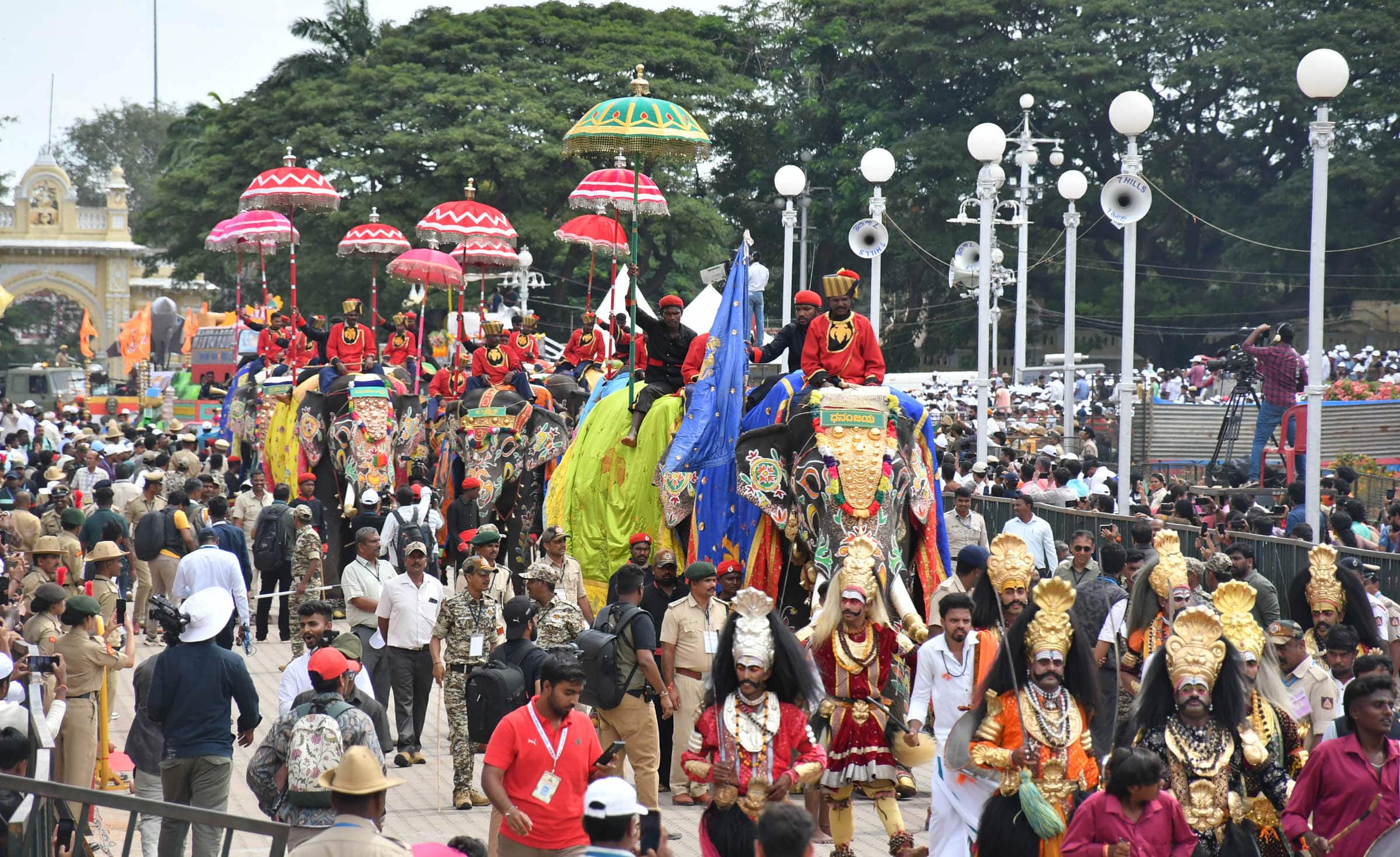 ನಿಶಾನೆ ಆನೆ ಧನಂಜಯ ಮುಖ್ಯಮಂತ್ರಿ ಸಿದ್ದರಾಮಯ್ಯ, ಉಪ ಮುಖ್ಯಮಂತ್ರಿ ಡಿ.ಕೆ. ಶಿವಕುಮಾರ್ ಸೇರಿದಂತೆ ನೆರೆದಿದ್ದ ಗಣ್ಯರಿಗೆ, ಜನಸ್ತೋಮಕ್ಕೆ ವಂದಿಸಿ ವಿಜಯದಶಮಿ ಮೆರವಣಿಗೆ ಮುನ್ನಡೆಸಿತು. ಇದನ್ನು ಹಿಂಬಾಲಿಸಿಕೊಂಡು ನೌಫತ್ ಆನೆಯಾಗಿ ಗೋಪಿ ಸಾಗಿ ಬಂತು. ಉಳಿದ ಆನೆಗಳು ಸಾಲಾನೆಗಳಾಗಿ ಸಾಗುವ ಮೂಲಕ ದಸರಾ ಮೆರವಣಿಗೆಗೆ ಮೆರುಗು ಹೆಚ್ಚಿಸಿದವು.14 ಆನೆಗಳೂ ಭಾಗಿ