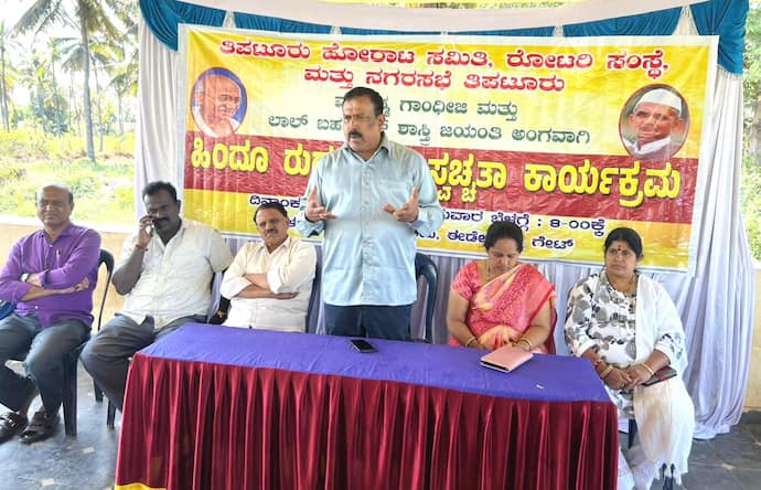 ಸ್ವಚ್ಛತೆ ಅರಿವು ಪ್ರತಿ ಪ್ರಾಣಿ ಪಕ್ಷಿಗಳಲ್ಲಿಯೂ ಇದೆ. ಬುದ್ದಿವಂತನಾದ ಮನುಷ್ಯ ಸ್ವಚ್ಛತೆ ಬಗ್ಗೆ ಹೆಚ್ಚು ಅರಿವು ಇಟ್ಟುಕೊಳ್ಳಬೇಕು. ನಮ್ಮ ಸುತ್ತಮುತ್ತ ವಾತಾವರಣದ ಜೊತೆಗೆ ನಮ್ಮ ಊರು, ದೇವಾಲಯ, ಶಾಲೆ, ಬೀದಿ ಹಾಗೀ ಇದೇ ರೀತಿ ನಗರ, ಪಟ್ಟಣದಲ್ಲೂ ಸ್ವಚ್ಛತೆ ಕಾಪಾಡಿಕೊಳ್ಳಬೇಕು. ಬದುಕಿದ್ದಾಗ ಮನುಷ್ಯ ನೆಮ್ಮದಿಯಾಗಿ ಇರುತ್ತಾನೋ ಇಲ್ಲವೂ, ಸತ್ತ ಮೇಲೆ ನೆಮ್ಮದಿಯಾಗಿ ಸಂಸ್ಕಾರ ಮಾಡುವ ಸ್ಥಳ ಸ್ವಚ್ಛವಾಗಿರಬೇಕು ಎನ್ನುವ ದೃಷ್ಠಿಯಿಂದ ಕಳೆದ ಹದಿನಾಲ್ಕು ವರ್ಷಗಳಿಂದ ನಾನು ಅನೇಕ ಸಂಘ ಸಂಸ್ಥೆಗಳ ಸಹಯೋಗದಲ್ಲಿ ಹಿಂದೂ ರುದ್ರಭೂಮಿಯ ಸ್ವಚ್ಛತಾ ಕಾರ್ಯ ಮಾಡುತ್ತಾ ಬಂದಿದ್ದು ಎಲ್ಲರೂ ಸ್ವಚ್ಛತಾ ಸೇವಾ ಕಾರ್ಯಕ್ಕೆ ಕೈ ಜೋಡಿಸಬೇಕು ಎಂದರು.ದೇಶ ಹಾಗೂ ಧರ್ಮದ ರಕ್ಷಣೆಗಾಗಿ ನೂರಾರು ವರ್ಷಗಳ ಹಿಂದೆ ಬಲಿರಾಮ್ ಹೆಗಡೆವಾರ್ ಸ್ಥಾಪನೆ ಮಾಡಿದ ರಾಷ್ಟ್ರೀಯ ಸ್ವಯಂ ಸೇವಕ ಸಂಘ ನೂರು ವರ್ಷ ಪೂರೈಸಿದ್ದು, ಪ್ರತಿಗ್ರಾಮಗಳಲ್ಲಿಯೂ ಸಂಘದ ಕಾರ್ಯಕರ್ತರು ಸ್ವಚ್ಛತಾ ಕಾರ್ಯಕೈಗೊಂಡಿದ್ದಾರೆ. ಅ.೧೨ರಂದು ತಿಪಟೂರಿನಲ್ಲಿ ರಾಷ್ಟ್ರೀಯ ಸ್ವಯಂ ಸೇವಕ ಸಂಘದ ಪಥಸಂಚಲನ ಆಯೋಜಿಸಿದ್ದು ಹೆಚ್ಚಿನ ನಾಗರೀಕರು ಗಣವೇಶದೊಂದಿಗೆ ಭಾಗವಹಿಸಬೇಕು ಎಂದರು. ಕಾರ್ಯಕ್ರಮದಲ್ಲಿ ರೋಟರಿ ಸಂಸ್ಥೆ ಅಧ್ಯಕ್ಷೆ ವನೀತಾ ಪ್ರಸನ್ನ, ನಗರಸಭಾ ಮಾಜಿ ಉಪಾಧ್ಯಕ್ಷ ಸೊಪ್ಪುಗಣೇಶ್, ಸದಸ್ಯರಾದ ಭಾರತೀ ಮಂಜುನಾಥ್, ಕನ್ನಡ ಸಾಹಿತ್ಯ ಪರಿಷತ್ ಅಧ್ಯಕ್ಷ ಬಸವರಾಜು, ಶರಣ ಸಾಹಿತ್ಯ ಪರಿಷತ್ ಅಧ್ಯಕ್ಷ ಗುರುಸ್ವಾಮಿ ಸೇರಿದಂತೆ ವಿವಿಧ ಸಂಘ ಸಂಸ್ಥೆಗಳವರು, ಪೌರಕಾರ್ಮಿಕರು ಭಾಗವಹಿಸಿದ್ದರು.