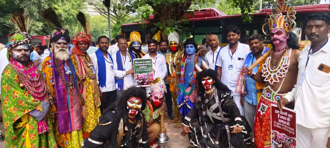 ರಾಮ, ಲಕ್ಷ್ಮಣ, ರಾವಣ, ದುರ್ಗಾ, ಆಂಜನೇಯ ಮುಂತಾದ ವೇಷ ತೊಟ್ಟ ಕಲಾವಿದರು ತಮ್ಮ ಕಲಾ ರೂಪಗಳಲ್ಲೇ ತಮ್ಮ ನೋವನ್ನು ಹೊರಹಾಕಿದರು. ತಮಗೆ ತಾವೇ ಚಾಟಿಯಲ್ಲಿ ಬಿಗಿದುಕೊಳ್ಳುತ್ತಿದ್ದರೂ ಇಡೀ ಸಮಾಜಕ್ಕೆ ಆ ಏಟು ಬೀಳುವಂತೆ ಗೋಚರಿಸುತ್ತಿತ್ತು. ಬೆಳಗ್ಗೆ 10ರಿಂದ 12.30ರ ತನಕ ಪ್ರತಿಭಟನೆ ನಡೆಸಿ ನಂತರ ಕಾಂಗ್ರೆಸ್ ಮುಖಂಡರನ್ನು ಕಾಣಲು ಕಾಂಗ್ರೆಸ್ ಕಚೇರಿಯ ಕಡೆ ಪ್ರತಿಭಟನಾಕಾರರು ಹೆಜ್ಜೆಹಾಕಿದರು. ಮಧ್ಯಪ್ರವೇಶಿಸಿದ ದಿಲ್ಲಿ ಪೊಲೀಸರು, ಬಿಗಿಬಂದೋಬಸ್ತಿನ ಕಾರಣ ರಸ್ತೆಗಳಲ್ಲಿ ಮೆರವಣಿಗೆಯಲ್ಲಿ ಹೋಗಲು ಅವಕಾಶವಿಲ್ಲ, ನಾವೇ ವಾಹನಗಳಲ್ಲಿ ಕರೆದೊಯ್ಯುತ್ತೇವೆ ಎಂದು ಬಸ್ಗಳ ವ್ಯವಸ್ಥೆ ಮಾಡಿದರು.ಕಾಂಗ್ರೆಸ್ ಕಚೇರಿಯ ಎದುರು ಅಲೆಮಾರಿ ಸಮುದಾಯದ ಆಕ್ರೋಶ ವ್ಯಕ್ತಗೊಳ್ಳುತ್ತಿತ್ತು. ಎಐಸಿಸಿ ಮುಖಂಡರು ಎಲ್ಲರನ್ನೂ ಒಳಗೆ ಬಿಡಿ ಎಂದು ಹೇಳಿದರೂ ದಿಲ್ಲಿ ಪೊಲೀಸರು ಅವಕಾಶ ಕೊಡಲಿಲ್ಲ. ಏನಾದರೂ ಅಚಾತುರ್ಯ ನಡೆದರೆ ನಾವು ಹೊಣೆಯಾಗಬೇಕಾಗುತ್ತದೆ. ಪ್ರತಿನಿಧಿಗಳನ್ನು ಮಾತ್ರ ಬಿಡಲು ಸಾಧ್ಯ ಎಂದು ಬಿಡಲಿಲ್ಲ. ನಿಯೋಗ ಮಾತ್ರವೇ ಕಾಂಗ್ರೆಸ್ ನಾಯಕರನ್ನು ಭೇಟಿ ಮಾಡಿ ಮಾತನಾಡಲು ಸಾಧ್ಯವಾಯಿತು ಎಂದರು.