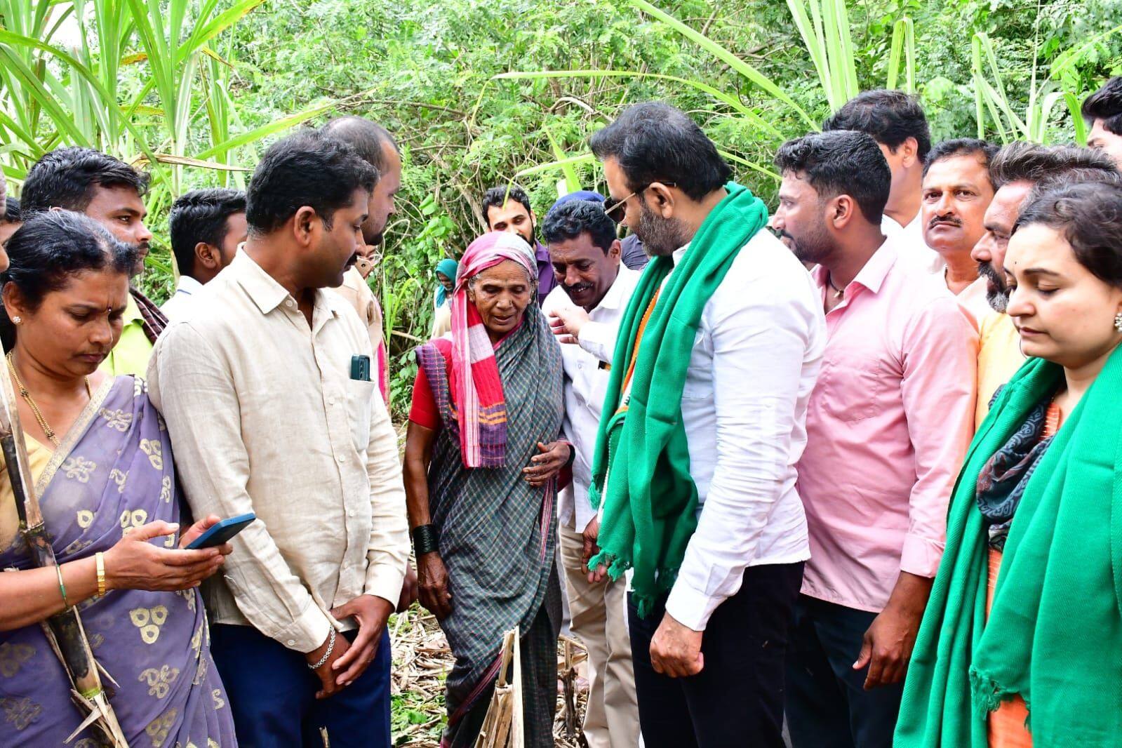 ಹುಲ್ಲಂಬಿ ಗ್ರಾಮದ ಕಬ್ಬಿನ ಬೆಳೆವೀಕ್ಷಣೆ: ನಂತರ ಸಚಿವರು ಹುಲ್ಲಂಬಿ ಗ್ರಾಮ ವ್ಯಾಪ್ತಿಯ ಕಬ್ಬಿನ ತೋಟಗಳಿಗೆ ಭೇಟಿ ನೀಡಿ, ಬೆಳೆಹಾನಿ ಪರಿಶೀಲಿಸಿ, ಮನವಿ ಸ್ವೀಕರಿಸಿದರು.ಈ ಸಂದರ್ಭದಲ್ಲಿ ರೈತರು ಮಾತನಾಡಿ, ಅಂದಾಜು 100-1500 ಎಕರೆ ಕಾಡು ಪ್ರಾಣಿಗಳ ಹಾವಳಿಯಿಂದಾಗಿ ಹುಲ್ಲಂಬಿ ಗ್ರಾಮದ ಸುಮಾರು 24 ಜನ ರೈತರ ಜಮೀನಿನ ಬೆಳೆ ಹಾನಿಯಾಗಿದೆ. ಕಬ್ಬು ಹಾಗೂ ಮಾವಿನ ತೋಟದ ಬೆಳೆಗಳನ್ನು ಸಹ ಕಾಡುಪ್ರಾಣಿಗಳು ಹಾಳು ಮಾಡುತ್ತಿವೆ. ಇದರಿಂದಾಗಿ ಬೀಜ, ಗೊಬ್ಬರ ಎಲ್ಲವೂ ಹಾಳಾಗುತ್ತಿದೆ. ಕಾಡುಪ್ರಾಣಿಗಳನ್ನು ಹೆದರಿಸಿ, ಓಡಿಸಲು ನಮಗೆ ಬಂದೂಕು ಬಳಕೆಗೆ ಅನುಮತಿಯನ್ನು ಕೊಡಿಸಬೇಕೆಂದು ಕೋರಿದರು. ರೈತರಿಗೆ ಸೂಕ್ತ ಪರಿಹಾರ ಹಾಗೂ ಸಹಾಯ ಧನ ನೀಡಬೇಕೆಂದು ವಿನಂತಿಸಿದರು.