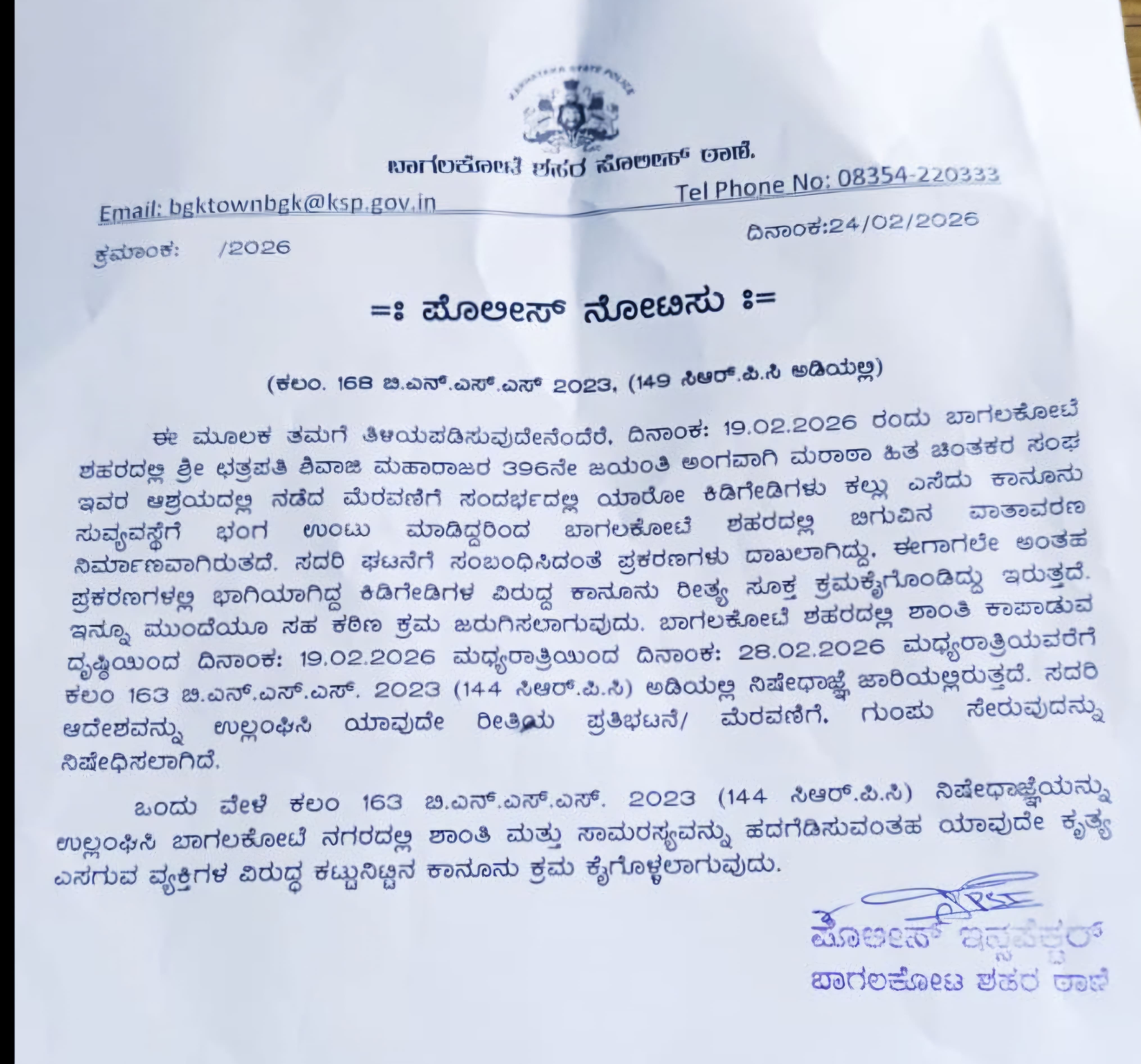 ಬಾಗಲಕೋಟೆ ನಗರದಲ್ಲಿ ಕಲ್ಲು ತೂರಾಟ, ಚಪ್ಪಲಿ ಎಸೆತ ಪ್ರಕರಣಕ್ಕೆ ಸಂಬಂಧಿಸಿದಂತೆ ಹಿಂದೂ ಸಂಘಟನೆಗಳ ಮುಖಂಡರಿಗೆ ಪೊಲೀಸರು ನೋಟಿಸ್ ನೀಡಿದ್ದು, ಬಾಗಲಕೋಟೆಯ ಕಿಲ್ಲಾ ಓಣಿಯ 50ಕ್ಕೂ ಅಧಿಕ ಹಿಂದೂ ಕಾರ್ಯಕರ್ತರಿಗೆ ನೊಟೀಸ್ ನೀಡಿದ್ದಾರೆ.ಶಾಂತಿ ಸಾಮರಸ್ಯ ಕದಡುವ ಕೃತ್ಯದಲ್ಲಿ ಭಾಗಿಯಾದರೆ ಕಠಿಣ ಕ್ರಮದ ಕೈಗೊಳ್ಳುವುದಾಗಿ ನೊಟೀಸ್ನಲ್ಲಿ ಹೇಳಿದ್ದಾರೆ. ಜೊತೆಗೆ ಡಂಗೂರ ಸಾರುವ ಮೂಲಕವೂ ಪ್ರತಿಭಟನೆಯಲ್ಲಿ ಭಾಗಿಯಾಗದಂತೆ ಜಿಲ್ಲಾದ್ಯಂತ ಪೊಲೀಸರು ಎಚ್ಚರಿಕೆ ನೀಡಿದ್ದಾರೆ.