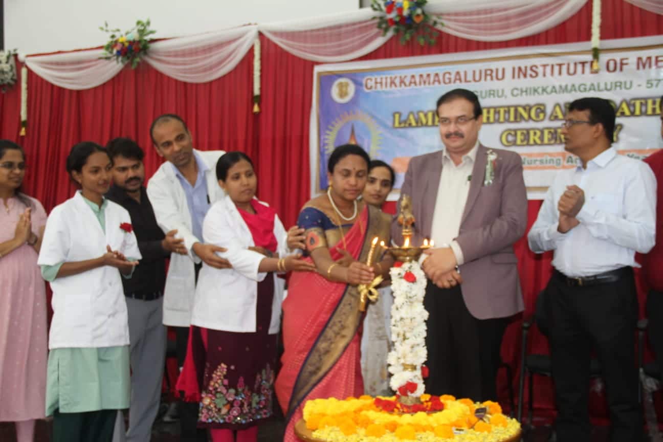 ಚಿಕ್ಕಮಗಳೂರು ಮೆಡಿಕಲ್ ಕಾಲೇಜಿನ ಬಿಎಸ್ಸಿ ನರ್ಸಿಂಗ್ ಕಾಲೇಜಿನಲ್ಲಿ ಪ್ರಥಮ ವರ್ಷದ ನರ್ಸಿಂಗ್ ವಿದ್ಯಾರ್ಥಿಗಳಿಗೆ ಏರ್ಪಡಿಸಿದ್ದ ದೀಪ ಪ್ರಜ್ವಲನ ಮತ್ತು ಪ್ರಮಾಣವಚನ ಸ್ವೀಕಾರ ಸಮಾರಂಭವನ್ನು ಡಾ.ಎಂ.ಆರ್.ಹರೀಶ್ ಉದ್ಘಾಟಿಸಿದರು. ವರಮಹಾಲಕ್ಷ್ಮೀ, ಡಾ.ಗಣೇಶ್ ಪಿ.ಸುಬ್ಬಯ್ಯ ಮೊದಲಾದವರಿದ್ದರು.
