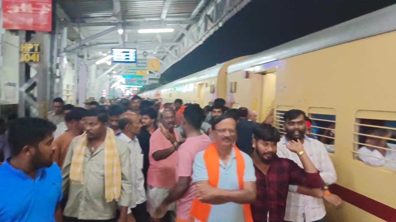ಹೊಸಪೇಟೆ: ಮೈಸೂರಿನಿಂದ ಅಯೋಧ್ಯಾ ಧಾಮಕ್ಕೆ ತೆರಳುತ್ತಿದ್ದ ರೈಲಿನಲ್ಲಿ ಅನ್ಯ ಕೋಮಿನ ಯುವಕನೋರ್ವ ಆಕ್ಷೇಪಾರ್ಹ ಪದ ಬಳಸಿ ಘೋಷಣೆ ಕೂಗಿ ಹೊಸಪೇಟೆ ರೈಲು ನಿಲ್ದಾಣದಲ್ಲಿ ಇಳಿದು ಹೋದ ಹಿನ್ನೆಲೆಯಲ್ಲಿ ಪ್ರಯಾಣಿಕರು ಹಾಗೂ ಭಕ್ತರು ಗುರುವಾರ ರಾತ್ರಿ ಹೊಸಪೇಟೆಯಲ್ಲಿ ರೈಲನ್ನು ಸುಮಾರು 2 ಗಂಟೆಗಳ ಕಾಲ ನಿಲ್ಲಿಸಿ ಪ್ರತಿಭಟಿಸಿದರಲ್ಲದೇ ಆರೋಪಿಯ ವಿರುದ್ಧ ಕಠಿಣ ಕ್ರಮ ಕೈಗೊಳ್ಳಬೇಕೆಂದು ಆಗ್ರಹಿಸಿದರು.