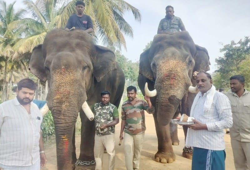 22ಸಿಎಚ್ಎನ್4ಚಾಮರಾಜನಗರ ತಾಲೂಕಿನ ನಂಜದೇವನಪುರದಲ್ಲಿ ಹುಲಿಗಳ ಸೆರೆಗೆ ಕೂಬಿಂಗ್ ಕಾರ್ಯಾಚರಣೆಗೆ ಬಂದ ಆನೆಗಳನ್ನು ಗ್ರಾಮಸ್ಥರು ಪೂಜೆ ಮಾಡಿ ಬರಮಾಡಿಕೊಂಡರು.