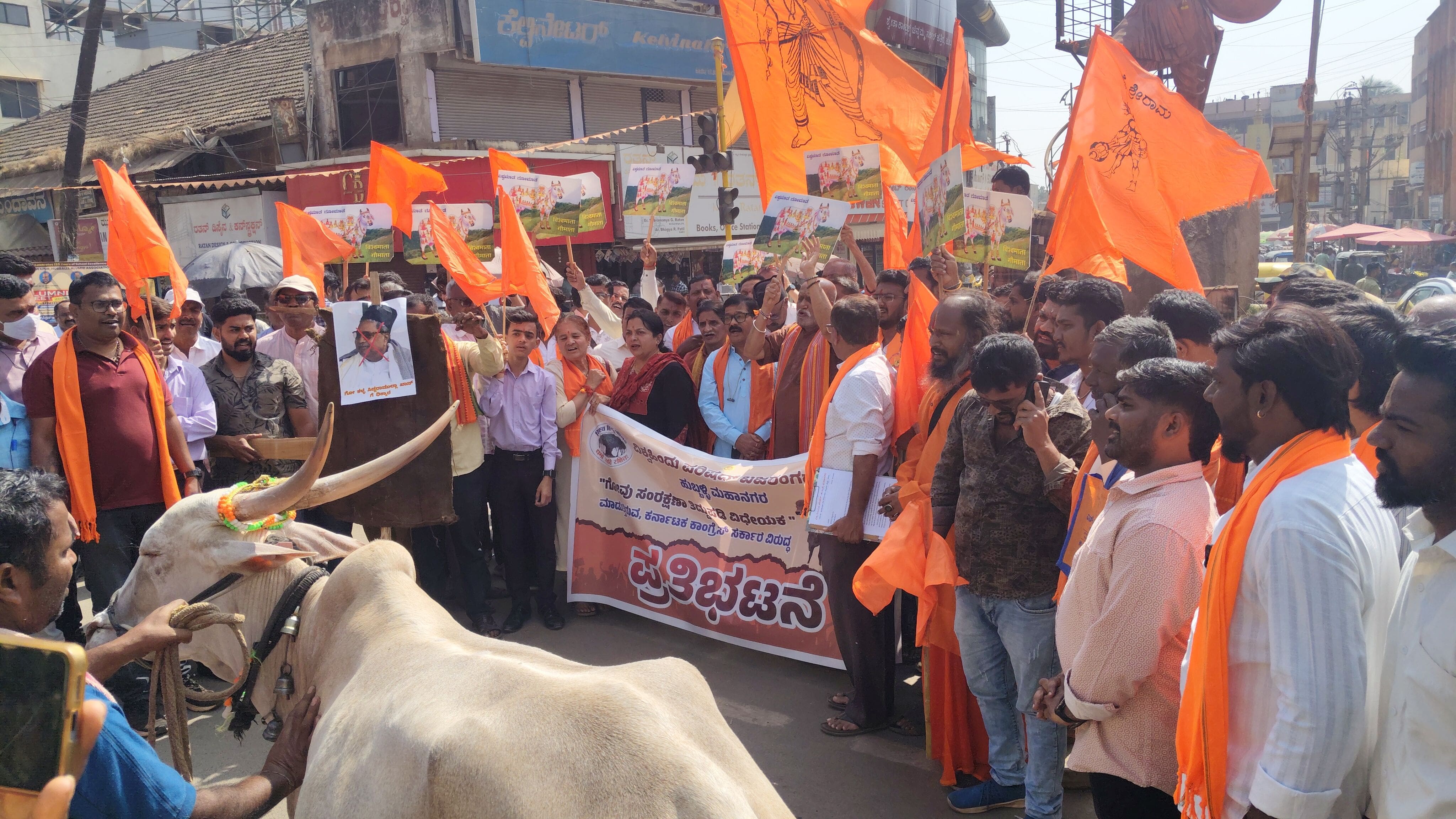 ಗೋಹತ್ಯೆ ಕಾಯ್ದೆಗೆ ತಿದ್ದುಪಡಿ ತರಲು ಮುಂದಾದ ಕಾಂಗ್ರೆಸ್ ಸರ್ಕಾರದ ನಡೆ ಖಂಡಿಸಿ ವಿಶ್ವ ಹಿಂದೂ ಪರಿಷತ್ ಸೇರಿದಂತೆ ವಿವಿಧ ಹಿಂದೂಪರ ಸಂಘಟನೆಗಳ ವತಿಯಿಂದ ನಗರದಲ್ಲಿ ಸೋಮವಾರ ಗೋವಿನೊಂದಿಗೆ ಬೃಹತ್ ಪ್ರತಿಭಟನೆ ಹಮ್ಮಿಕೊಳ್ಳಲಾಯಿತು.ಇಲ್ಲಿನ ಸಂಗೊಳ್ಳಿ ರಾಯಣ್ಣ ವೃತ್ತದಲ್ಲಿ ಸಮಾವೇಶಗೊಂಡ ಪ್ರತಿಭಟನಾಕಾರರು ಕಾಂಗ್ರೆಸ್ ಸರ್ಕಾರ ಹಾಗೂ ಸಿಎಂ ಸಿದ್ದರಾಮಯ್ಯ ಮತ್ತು ಡಿಸಿಎಂ ಡಿ.ಕೆ. ಶಿವಕುಮಾರ ವಿರುದ್ಧ ವಿವಿಧ ಘೋಷಣೆ ಕೂಗುವ ಮೂಲಕ ಮುಖ್ಯಮಂತ್ರಿಗಳ ಪ್ರತಿಕೃತಿ ದಹಿಸಿ ಆಕ್ರೋಶ ವ್ಯಕ್ತಪಡಿಸಿದರು.