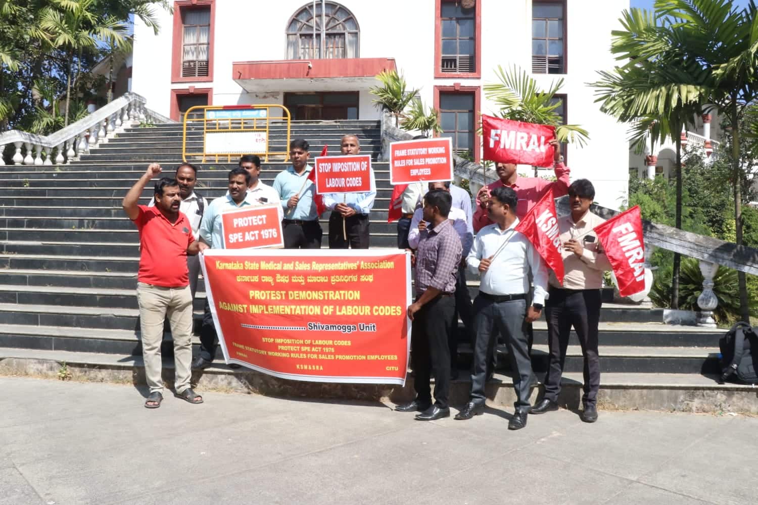 ಶಿವಮೊಗ್ಗ: ಔಷಧ ಮತ್ತು ಮಾರಾಟ ಪ್ರತಿನಿಧಿಗಳ ರಕ್ಷಣೆಗೆ ಇದ್ದಂತಹ ಕಾರ್ಮಿಕ ಸಂಹಿತೆಗಳನ್ನು ಬಿಟ್ಟು ಮಾರಕವಾಗುವ ಹೊಸ ಕಾರ್ಮಿಕ ಸಂಹಿತೆಗಳನ್ನು ಕೇಂದ್ರ ಸರ್ಕಾರವು ಜಾರಿಗೆ ತರಲು ಹೊರಟಿರುವುದನ್ನು ವಿರೋಧಿಸಿ ಬುಧವಾರ ಭಾರತ ವೈದ್ಯಕೀಯ ಮತ್ತು ಮಾರಾಟ ಪ್ರತಿನಿಧಿಗಳ ಸಂಘಗಳ ಒಕ್ಕೂಟದ ಜಿಲ್ಲಾ ಶಾಖೆಯಿಂದ ಜಿಲ್ಲಾಧಿಕಾರಿ ಕಚೇರಿ ಎದುರು ಪ್ರತಿಭಟನೆ ನಡೆಯಿತು.