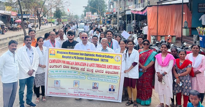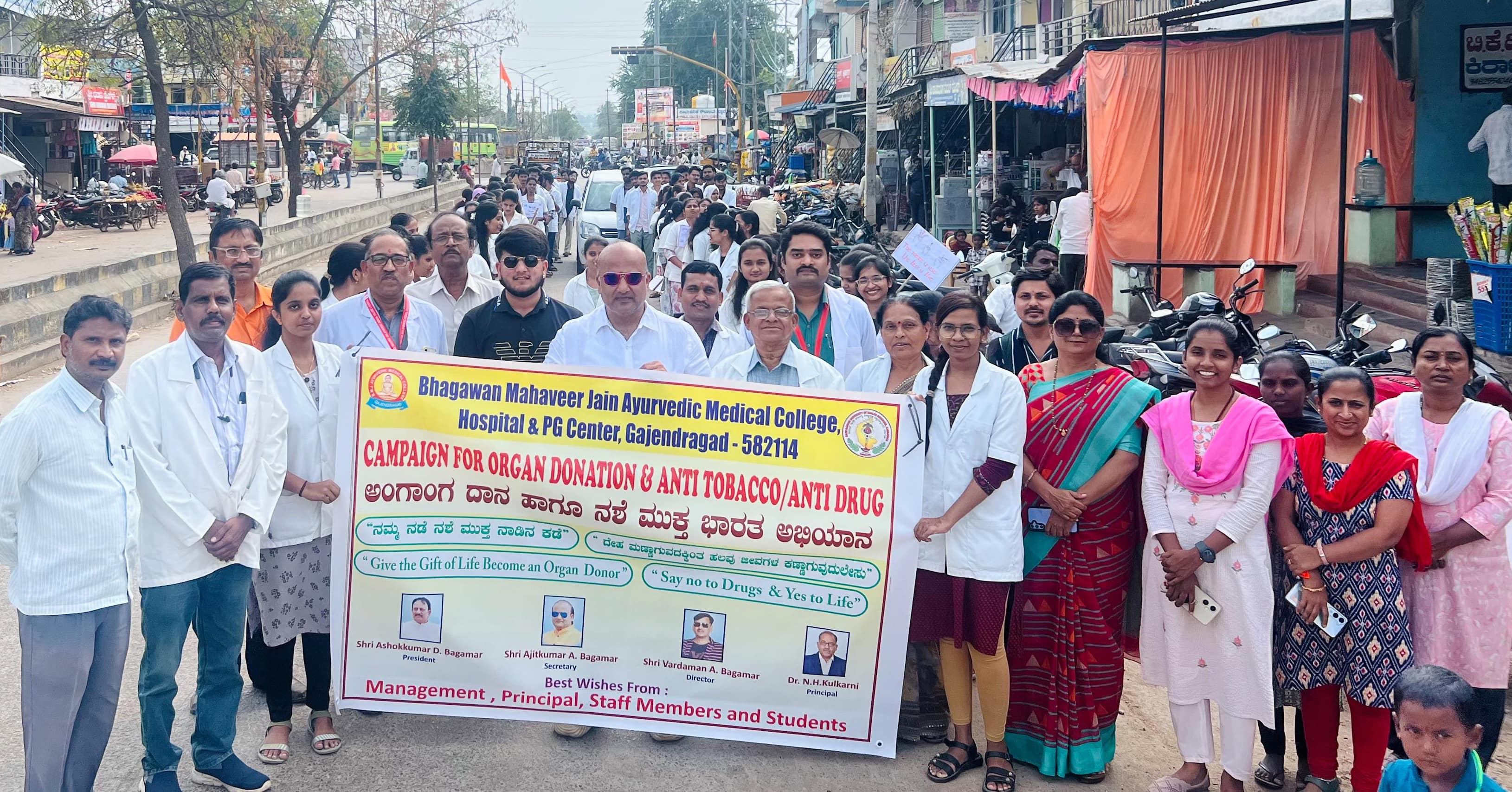 ಗಜೇಂದ್ರಗಡ: ಪಟ್ಟಣದ ಭಗವಾನ ಮಹಾವೀರ ಜೈನ್ ಆಯುರ್ವೇದಿಕ್ ಮೆಡಿಕಲ್ ಕಾಲೇಜಿನ ವಿದ್ಯಾರ್ಥಿಗಳು ಹಾಗೂ ಸಿಬ್ಬಂದಿಯಿಂದ ಅಂಗದಾನ ಮತ್ತು ನಶಾಮುಕ್ತ ಭಾರತ ಅಭಿಯಾನ ಕುರಿತು ಜಾಗೃತಿ ಇಲ್ಲಿನ ಕಾಲಕಾಲೇಶ್ವರ ವೃತ್ತದಲ್ಲಿ ನಡೆಯಿತು.