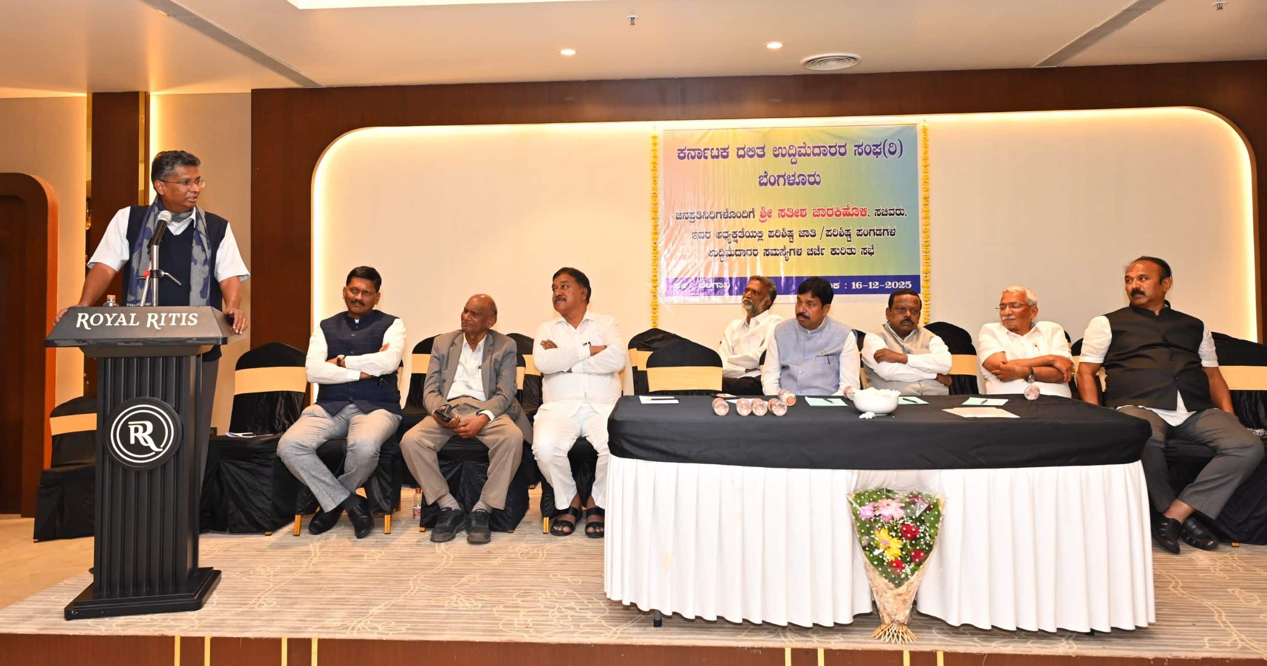 ನಿವೇಶನ, ಸಬ್ಸಿಡಿ, ಸಾಲ, ಉದ್ಯಮ ಅವಕಾಶದಲ್ಲಿ ಮೀಸಲು ಕುರಿತಂತೆ ದಲಿತ ಉದ್ದಿಮೆದಾರರ ಬಹುದಿನದ ಬೇಡಿಕೆಗಳನ್ನು ಈಡೇರಿಸಿಕೊಳ್ಳಲು ಸಚಿವರು, ಶಾಸಕರು ಮತ್ತು ಉದ್ದಿಮೆದಾರರು ಸೇರಿ ಸಂಘಟಿತ ಹೋರಾಟ ಮಾಡಲು ಮಂಗಳವಾರ ರಾತ್ರಿ ಖಾಸಗಿ ಹೊಟೇಲ್ನಲ್ಲಿ ನಡೆದ ''''ಕರ್ನಾಟಕ ದಲಿತ ಉದ್ದಿಮೆದಾರರ ಸಂಘ''''ದ ಸಭೆಯಲ್ಲಿ ನಿರ್ಧರಿಸಲಾಯಿತು.ಇದೇ ಮೊದಲ ಬಾರಿಗೆ ಲೋಕೋಪಯೋಗಿ ಸಚಿವ ಸತೀಶ ಜಾರಕಿಹೊಳಿ ನೇತೃತ್ವದಲ್ಲಿ ನಡೆದ ಸಂಘದ ಈ ಸಭೆಯಲ್ಲಿ ಭಾಗವಹಿಸಿದ್ದ ಸಚಿವರಾದ ಕೆ.ಎಚ್. ಮುನಿಯಪ್ಪ, ಆರ್.ಬಿ. ತಿಮ್ಮಾಪುರ, ಮೇಲ್ಮನೆ ಪ್ರತಿಪಕ್ಷದ ನಾಯಕ ಚಲವಾದಿ ನಾರಾಯಣಸ್ವಾಮಿ, ವಿಧಾನಸಭೆಯ ಉಪಸಭಾಧ್ಯಕ್ಷ ರುದ್ರಪ್ಪ ಲಮಾಣಿ ಸೇರಿದಂತೆ 32 ಜನ ಮೂರೂ ಪಕ್ಷಗಳ ದಲಿತ ಶಾಸಕರು ದಲಿತ ಉದ್ದಿಮೆದಾರರ ಬೇಡಿಕೆಗಳಿಗೆ ಬೆಂಬಲ ವ್ಯಕ್ತಪಡಿಸಿ ಸಂಘಟಿತರಾಗಿ ಮುಖ್ಯಮಂತ್ರಿಗಳ ಮುಂದೆ ಹಕ್ಕು ಮಂಡಿಸಲು ತಮ್ಮ ಸಮ್ಮತಿ ಸೂಚಿಸಿದರು.