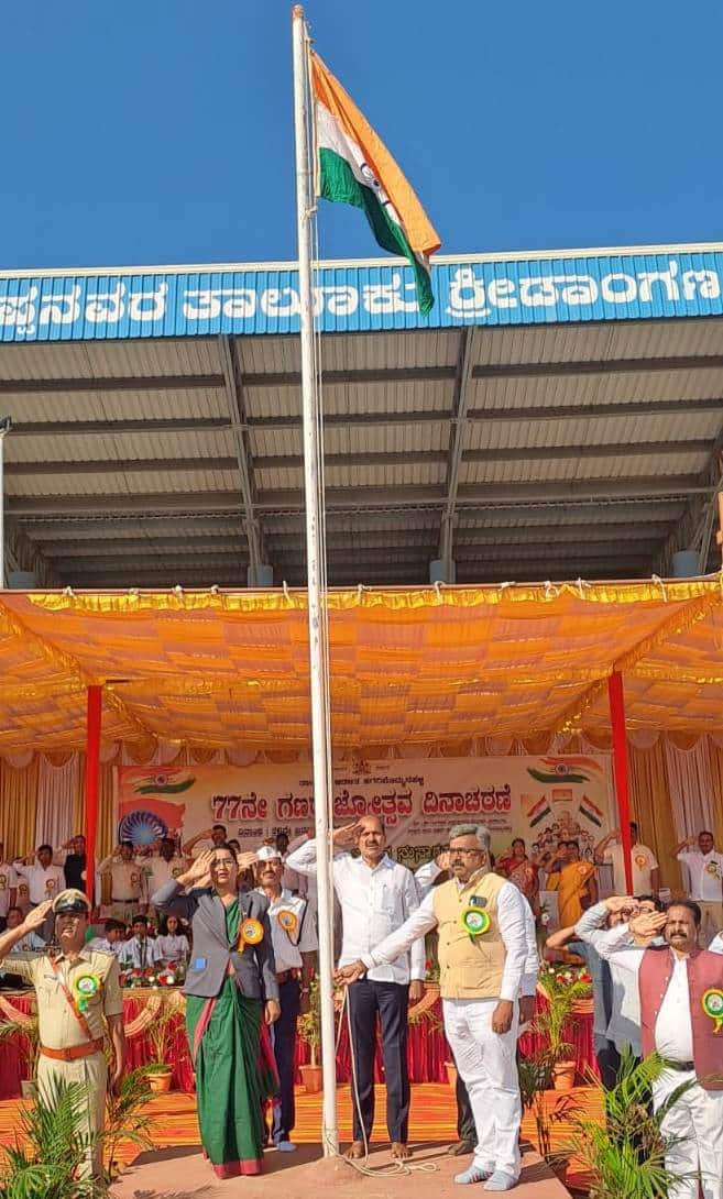 ಪಟ್ಟಣದ ಗಂಗಾವತಿ ಭೀಮಪ್ಪನವರ ಸರ್ಕಾರಿ ತಾಲೂಕು ಕ್ರೀಡಾಂಗಣದಲ್ಲಿ ತಾಲೂಕು ಆಡಳಿತದಿಂದ ಸೋಮವಾರ ಆಯೋಜಿಸಿದ್ದ ೭೭ನೇ ಗಣರಾಜ್ಯೋತ್ಸವ ಆಚರಣೆಯ ಸಮಾರಂಭದ ಅಧ್ಯಕ್ಷತೆ ವಹಿಸಿ ಅವರು ಮಾತನಾಡಿ, ನರೇಂದ್ರ ಮೋದಿ ಮುಂದಿನ ದಿನಗಳಲ್ಲಿ ಏಕರೂಪದ ಕಾನೂನುಗಳನ್ನು ಜಾರಿಗೊಳಿಸುವ ಮೂಲಕ ಯುವ ಸಮೂಹಕ್ಕೆ ಉದ್ಯೋಗ ಒದಗಿಸುವ ಜೊತೆಗೆ ತಾಂತ್ರಿಕತೆಯಲ್ಲಿ ಪ್ರಗತಿ ಸಾಧಿಸಿ ವಿಶ್ವ ಮಟ್ಟದಲ್ಲಿ ದೇಶವನ್ನು ಪ್ರಗತಿ ಪಥದಲ್ಲಿ ಸಾಗಿಸಲಿದ್ದಾರೆ ಎಂದು ತಿಳಿಸಿದರು.ಇದಕ್ಕೂ ಮುನ್ನ ತಹಸೀಲ್ದಾರ್ ಆರ್.ಕವಿತಾ ಧ್ವಜಾರೋಹಣ ನೆರವೇರಿಸಿ ಮಾತನಾಡಿದರು. ಸಮಾರಂಭದಲ್ಲಿ ವಿವಿಧ ಕ್ಷೇತ್ರಗಳಲ್ಲಿ ಸಾಧನೆಗೈದ ಸಂಗೀತ ಶಿಕ್ಷಕಿ ಶಾರದ ಮಂಜುನಾಥ, ಕಿಂಡ್ರಿ ಲಕ್ಷ್ಮೀಪತಿ, ಡಾ.ಹಾಲಮ್ಮ ಅರುಣ್, ರೇವಣಸಿದ್ದಾಚಾರಿ, ರಾಜ್ಯ ಮಟ್ಟದ ವಸ್ತು ಪ್ರದರ್ಶನದಲ್ಲಿ ಗಮನಾರ್ಹ ಸಾಧನೆಗೈದ ಸರ್ಕಾರಿ ಆದರ್ಶ ವಿದ್ಯಾಲಯದ ಎಂ.ಎಸ್.ರಾಹುಲ್, ಕೆ.ಶಾಬುದ್ಧೀನ್, ಪೌರ ಕಾರ್ಮಿಕರಾದ ಬಸಮ್ಮ, ಗಾಳೆಪ್ಪ, ಆರ್ಡಿಪಿಆರ್ ನವೀನ್ ಕುಮಾರ್, ಅಂಗನವಾಡಿ ಕಾರ್ಯಕರ್ತೆ ಕೆ.ಶಿಲ್ಪ, ನಿವೃತ್ತ ಸೈನಿಕ ಹನುಮಂತ ರೆಡ್ಡಿಯವರಿಗೆ ಸನ್ಮಾನಿಸಿ ಗೌರವಿಸಲಾಯಿತು