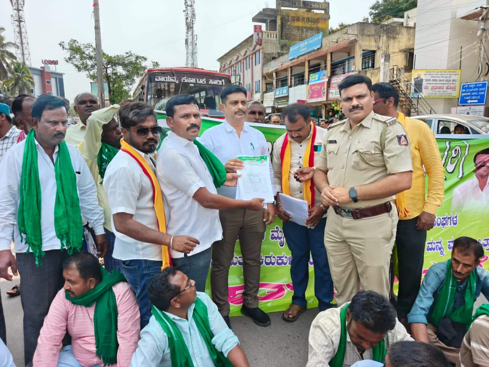 ರಾಣಿಬೆನ್ನೂರು: ನಗರದ ಬಸ್ ನಿಲ್ದಾಣದ ಬಳಿ ಬುಧವಾರ ವಿವಿಧ ಬೇಡಿಕೆಗಳ ಈಡೇರಿಕೆಗೆ ಆಗ್ರಹಿಸಿ ಕರ್ನಾಟಕ ರಾಜ್ಯ ರೈತ ಸಂಘದ ತಾಲೂಕು ಘಟಕದ ವತಿಯಿಂದ ಪ್ರತಿಭಟಿಸಿ ತಹಸೀಲ್ದಾರ್, ನಗರಸಭೆ ಆಯುಕ್ತ ಹಾಗೂ ಗ್ರಾಮೀಣ ಪಿಐ ಅವರಿಗೆ ಮನವಿ ಸಲ್ಲಿಸಲಾಯಿತು.