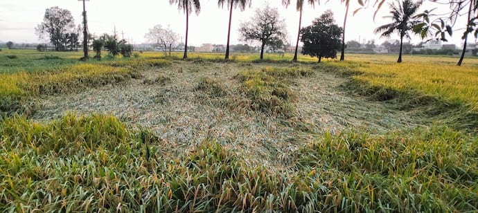 ಕಾರಟಗಿ: ವಾಯುಭಾರ ಕುಸಿತದಿಂದ ಪಟ್ಟಣ ಸೇರಿದಂತೆ ತಾಲೂಕಿನ ಹಲವು ಗ್ರಾಮಗಳಲ್ಲಿ ಮಂಗಳವಾರ ಸಂಜೆ ಸುರಿದ ಗಾಳಿಮಿಶ್ರಿತ ಮಳೆಯಿಂದ ರೈತರ ಜಮೀನಿನಲ್ಲಿ ಕಟಾವಿಗೆ ಬಂದ ಭತ್ತ ನೆಲಕಚ್ಚಿದೆ.