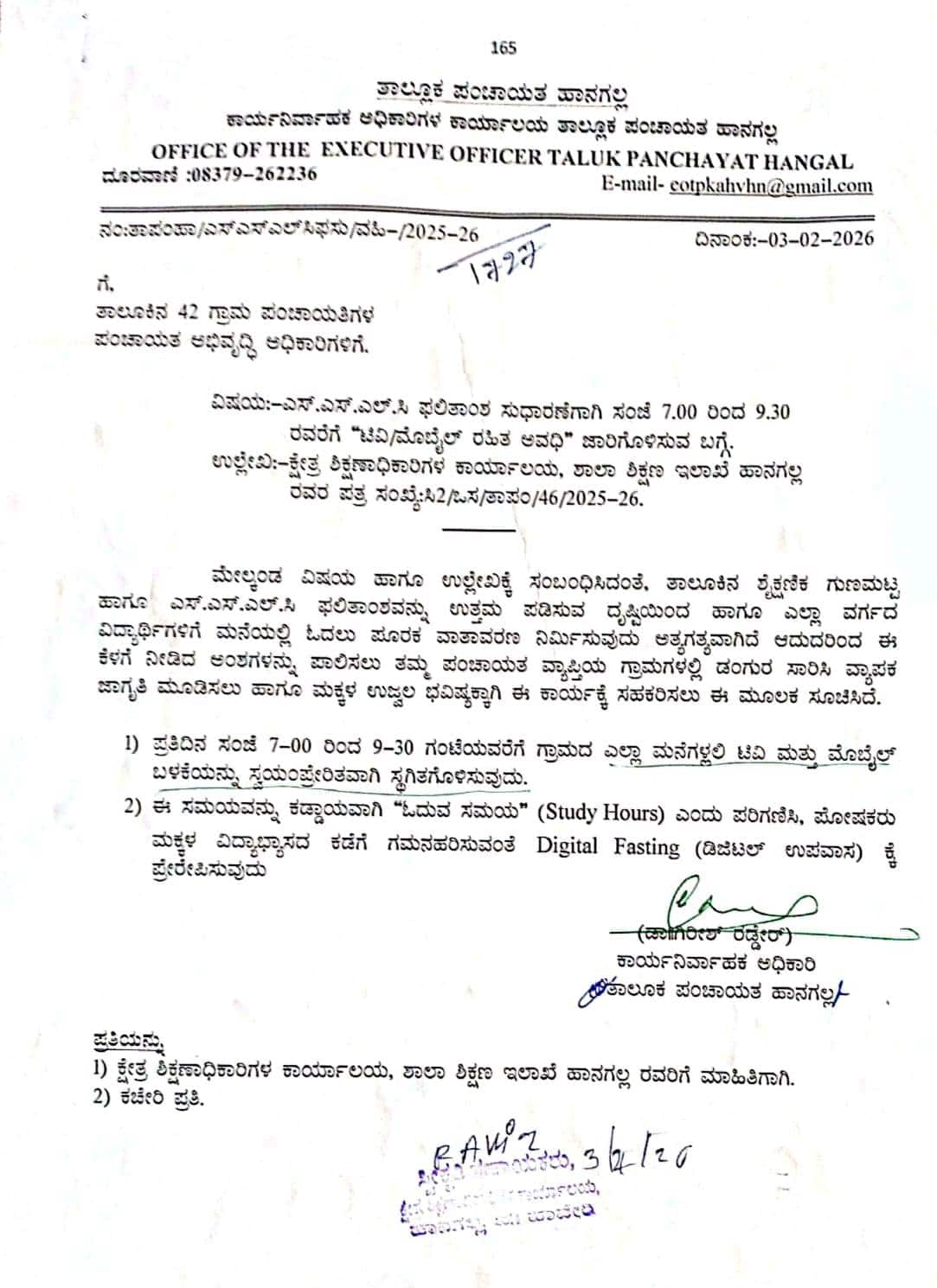 ನಿತ್ಯ ಸಂಜೆ 7ರಿಂದ 9.30ರ ವರೆಗೆ ಮಕ್ಕಳ ಓದುವ ಸಮಯ ಎಂದು ಪರಿಗಣಿಸಿ ಸ್ವಯಂಪ್ರೇರಿತರಾಗಿ ಎಲ್ಲ ಮನೆಗಳಲ್ಲಿ ದೂರದರ್ಶನ ಬಂದ್ ಮಾಡಿ, ಮೊಬೈಲ್ ಸದ್ದು ಇಲ್ಲದಂತೆ ಮಾಡಿ, ಮಕ್ಕಳ ಓದಿಗೆ ಸಹಕರಿಸಿ ಎಂದು ಪಿಡಿಒಗಳಿಗೆ ಆದೇಶ ರವಾನಿಸಲಾಗಿದೆ.