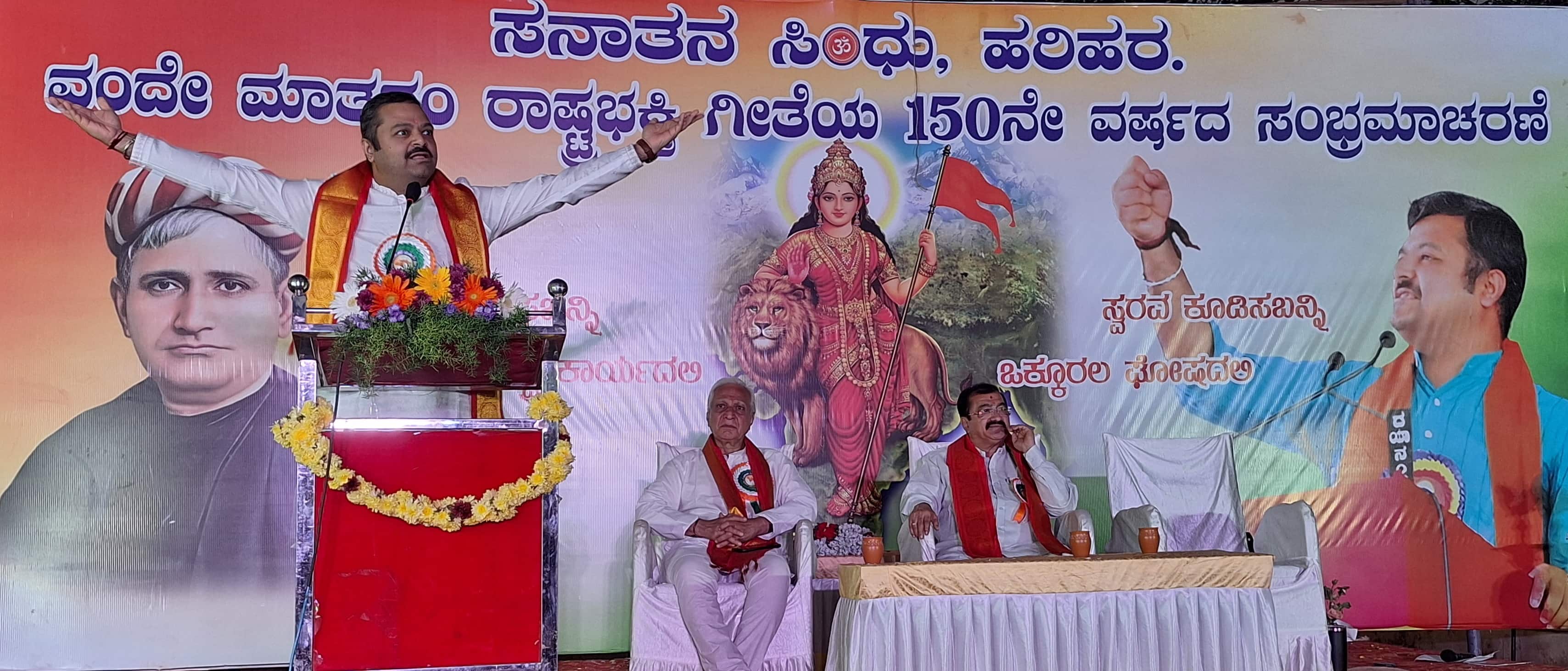 150 ವರ್ಷಗಳ ಹಿಂದೆಯೇ ಭಾರತೀಯರನ್ನು ಒಂದೇ ಭಾವನೆಯಲ್ಲಿ ಕಟ್ಟಿದ ವಂದೇ ಮಾತರಂ, ಇಂದಿಗೂ ಅದೇ ಶಕ್ತಿಯನ್ನು ಹೊಂದಿದೆ. ಭಾಷೆ, ಜಾತಿ, ಮತಗಳ ಭೇದ ಮರೆಸಿ ‘ನಾವು ಭಾರತೀಯರು’ ಎಂಬ ಭಾವನೆ ಮೂಡಿಸುವ ಸಾಮರ್ಥ್ಯ ಈ ಗೀತೆಗೆ ಇದೆ. ಅದಕ್ಕಾಗಿಯೇ ವಂದೇ ಮಾತರಂ ಕೇವಲ ಇತಿಹಾಸವಲ್ಲ; ಅದು ಇಂದಿಗೂ ಜೀವಂತ ರಾಷ್ಟ್ರಚಿಂತನೆಯ ಧ್ವನಿಯಾಗಿದೆ ಎಂದರು.ಶಾಸಕ ಬಿ.ಪಿ. ಹರೀಶ ಪ್ರಾಸ್ತಾವಿಕವಾಗಿ ಮಾತನಾಡಿದರು. ಸನಾತನ ಸಿಂಧು ಹರಿಹರ ಅಧ್ಯಕ್ಷರಾದ ಡಾ. ಆರ್.ಆರ್. ಖಮಿತ್ಕರ್, ಸದಸ್ಯರಾದ ನ್ಯಾಯವಾದಿ ವೀರೇಶ ಅಜ್ಜಣ್ಣನವರ, ಖಜಾಂಚಿ ಪ್ರಕಾಶ ಕೋಳೂರು, ಅಭಿಯಂತ ಶಿವಪ್ರಕಾಶ ಶಾಸ್ತ್ರಿ, ಕಾಂತರಾಜ, ಸುಂದರೇಶ ಇದ್ದರು. 155 ಮಹಿಳೆಯರು ಸುಮಧುರ ಕಂಠದಿಂದ ವಂದೇ ಮಾತರಂ ಗೀತೆಯನ್ನು ಹಾಡಿದರು. ಪೊಲೀಸರು ಬಂದೋ ಬಸ್ತ್ ಏರ್ಪಡಿಸಿದ್ದರು.